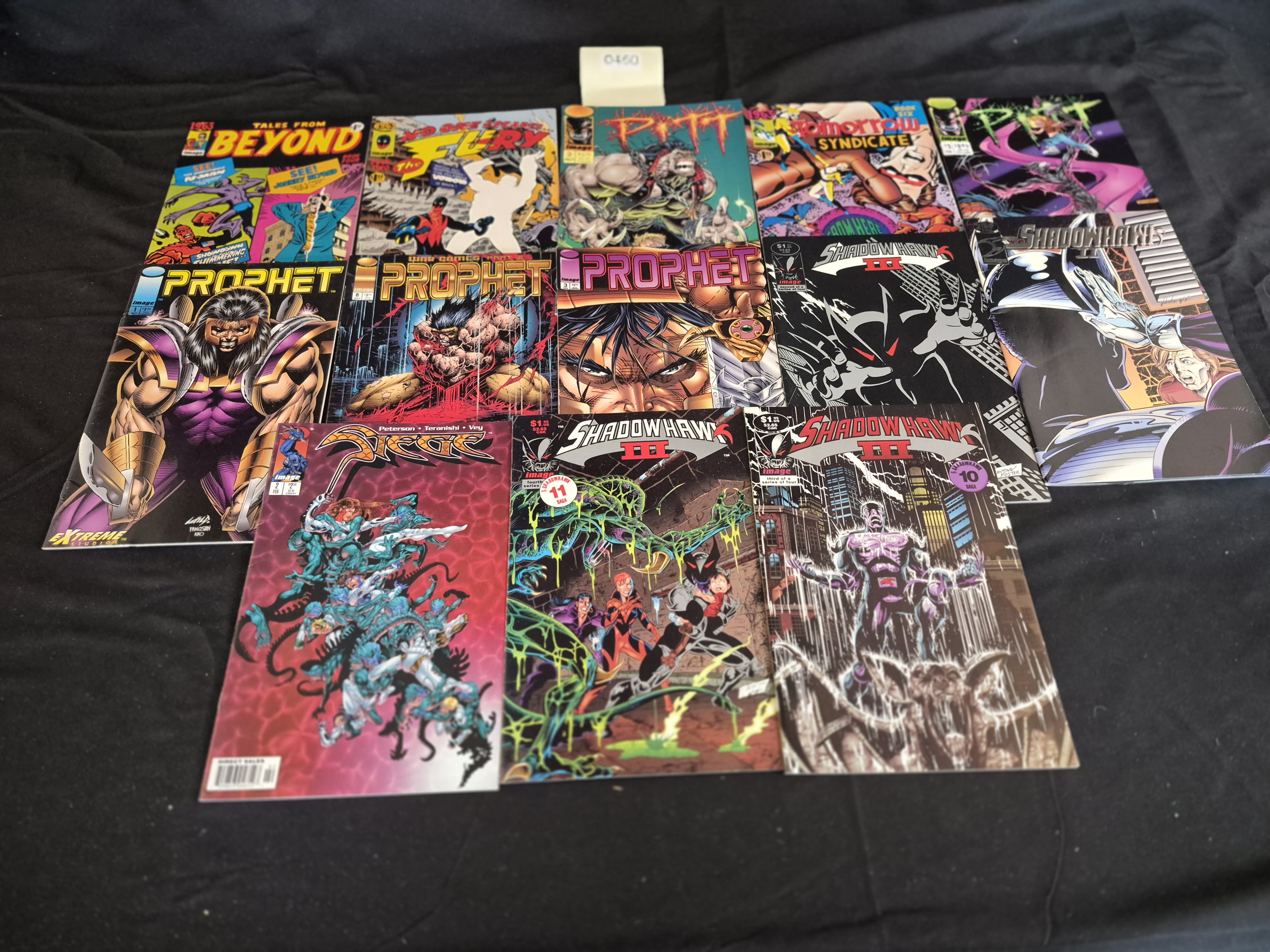 BID PER WHAT YOU SEE IN THE PHOTO, NOT THE AI GENERATED TITLES AND DESCRIPTIONS! A collection of 13 Modern Age comic books, primarily published by Image Comics and its imprints, dating from the early to mid-1990s. The lot includes various titles characteristic of the period’s aggressive, hyper-stylized superhero artwork. Specific titles observed include multiple issues of Prophet (including #1, #2, #3, and #8), ShadowHawk (including ShadowHawk III #10 and #11), Pitt, Tales from Beyond, Tomorrow Syndicate, Stryke, and Fury. Several covers bear the Image Comics logo and Image TM designations, with pricing typically listed at $1.95 US. One book explicitly features the Extreme Studios imprint logo. These items fall under the general category of 1990s indie comics.