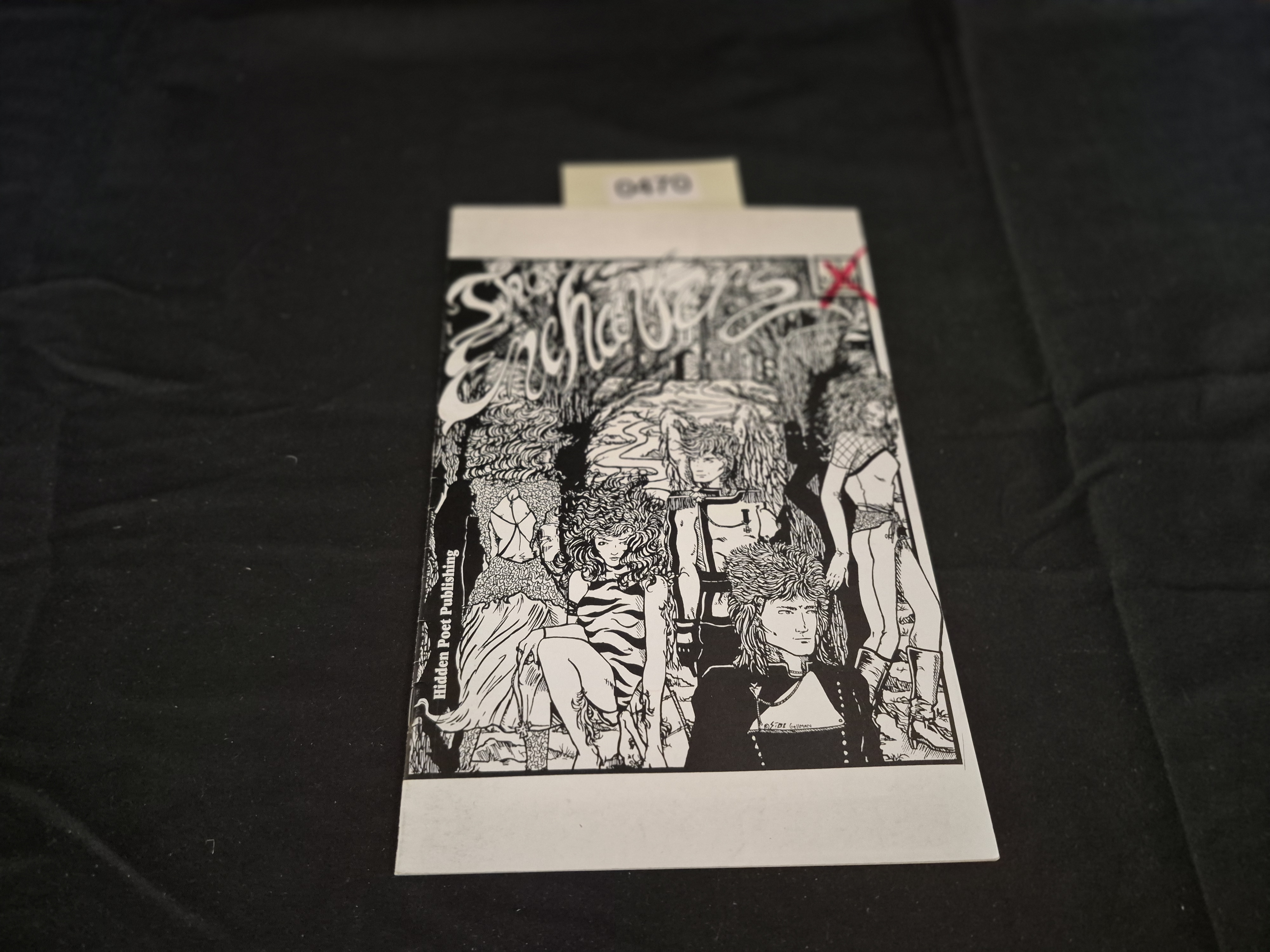 BID PER WHAT YOU SEE IN THE PHOTO, NOT THE AI GENERATED TITLES AND DESCRIPTIONS! A single comic book cover or print identified through market consensus as The Enchanters #1 School Daze, illustrated by Steven Gellman and published by Hidden Poet Publishing, circa 1996. The rectangular item features a detailed monochrome illustration rendered in black ink on white paper, depicting multiple figures in a stylized fantasy or underground comic aesthetic. The central title, “Enchanters,” is rendered in a flowing script at the top. The publisher’s name, “Hidden Poet Publishing,” is printed vertically along the left margin. The signature “STEVE GELLMAN” is faintly visible near the bottom of the illustration area. The item bears an inventory mark, a red ‘X’ in the upper right corner of the image field, and a paper tab bearing the inventory number “0470” is attached to the top edge.