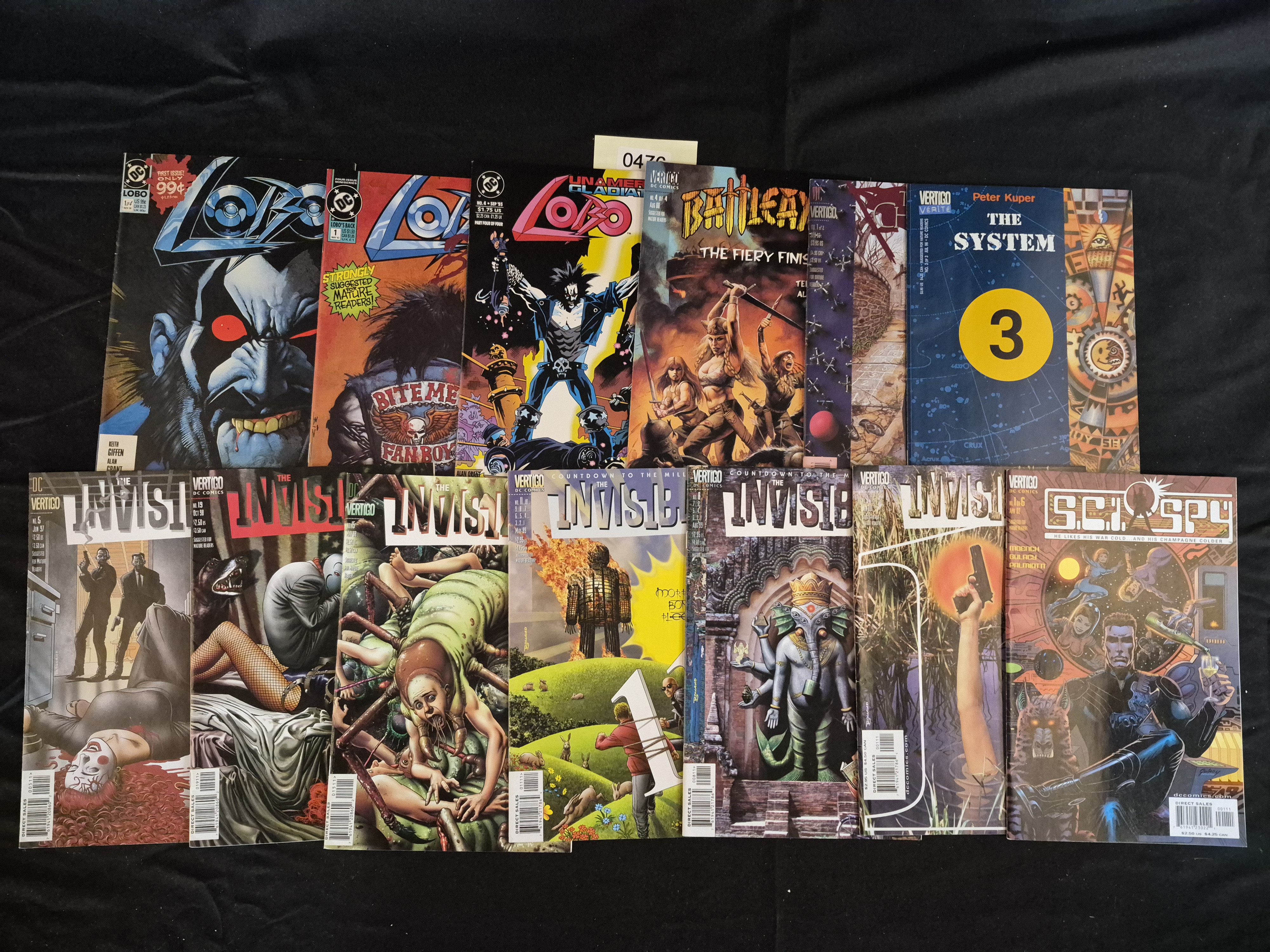 BID PER WHAT YOU SEE IN THE PHOTO, NOT THE AI GENERATED TITLES AND DESCRIPTIONS! A collection of 15 paper-bound publications, primarily consisting of standard-format comic books and one square-bound trade paperback graphic novel, published by DC Comics and its Vertigo imprint, dating from the 1990s and early 2000s. The lot focuses on fantasy, sci-fi, and action genres. Specific titles visible include a run of four issues of Lobo, seven issues of The Invisibles, one issue of Battlecry, one issue of Sci-Spy, and the trade paperback volume The System 3 by Peter Kuper. The items are printed on glossy paper and cardstock covers, featuring the colorful cover art typical of the period. Many items bear the “Suggested for Mature Readers” advisory. The collection is consistent with market listings for modern indie comic book lots.