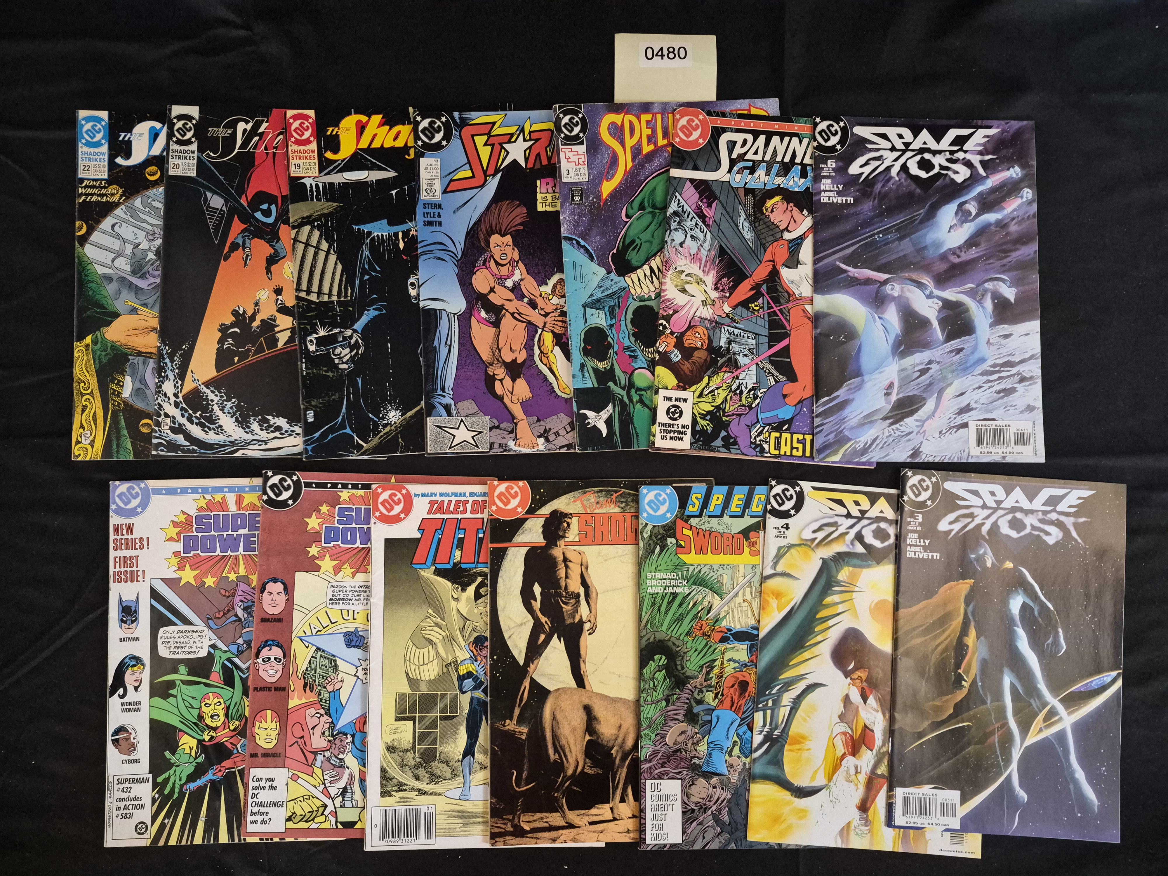 BID PER WHAT YOU SEE IN THE PHOTO, NOT THE AI GENERATED TITLES AND DESCRIPTIONS! A collection of 15 saddle-stitched periodical comic books published by DC Comics, dating primarily from the Copper Age and Modern Age (late 20th to early 21st centuries). The lot features glossy printed paper covers with full-color illustrations. Titles present in the collection include multiple issues of The Shadow Strikes (such as #19, #20, #22, #25), Starman (#3, #13), Space Ghost (#3, #6), Super Powers (#1, #4), Tales of the Teen Titans, Spelljammer, Spanner’s Galaxy #6, and Sword of the Atom #4. The collection is organized into two horizontal rows. An external identification tag labeled 0480 is present with the lot.