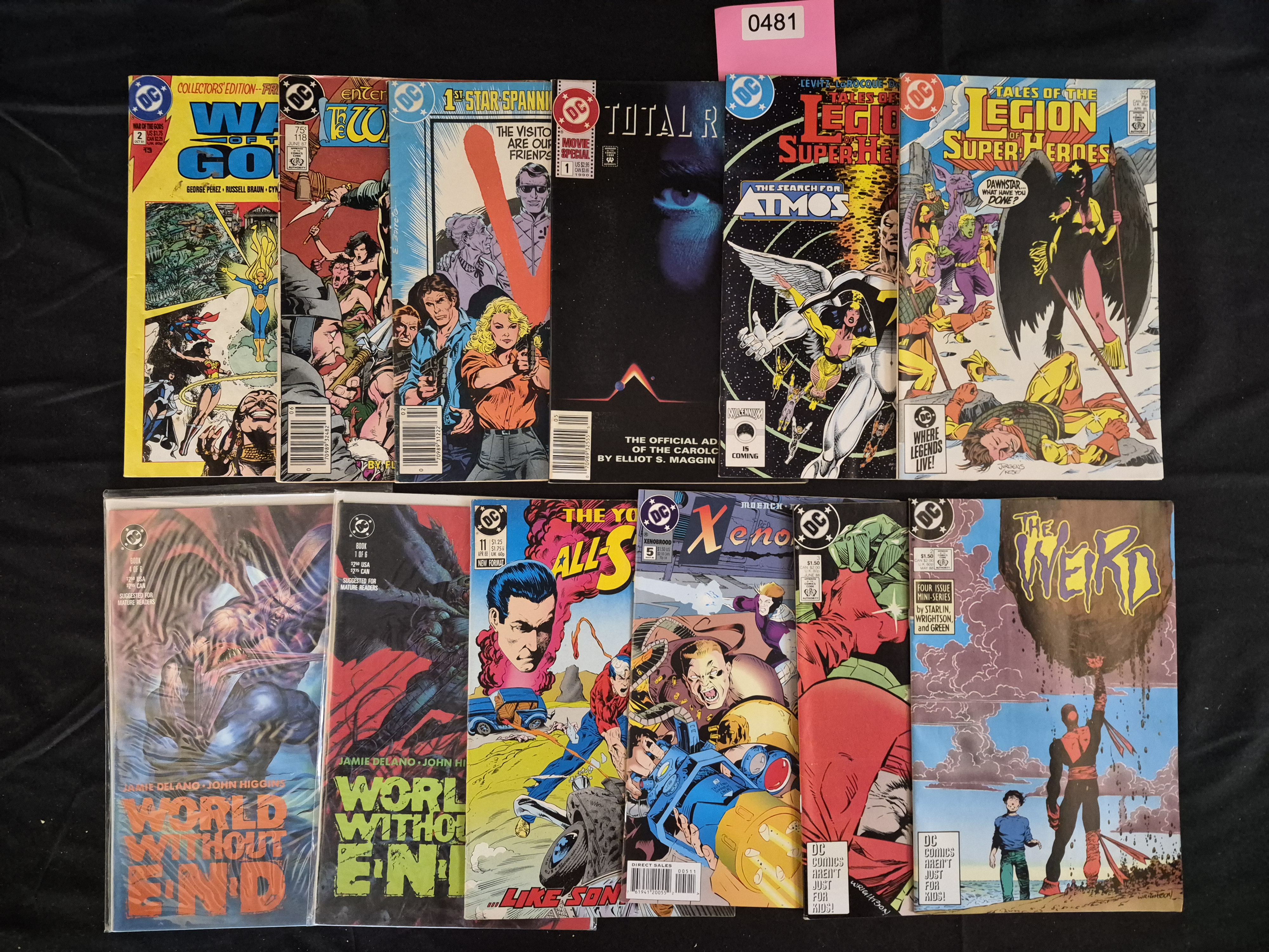 BID PER WHAT YOU SEE IN THE PHOTO, NOT THE AI GENERATED TITLES AND DESCRIPTIONS! A collection of 16 Modern Age American comic books published by DC Comics, primarily dating from the late 1980s and early 1990s. The lot includes various titles and issues, such as three issues of War of the Gods (including a Collector’s Edition), three issues of Tales of the Legion of Super-Heroes (including issue #322), V Movie Special #1, Total R, two issues of World Without End (Book 1 and Book 4), The Young All-Stars #11, Xenobrood #5, and The Weird (1 issue). Several issues, including those from the World Without End series, bear the DC Comics “Suggested for Mature Readers” advisory. The comics are unslabbed.