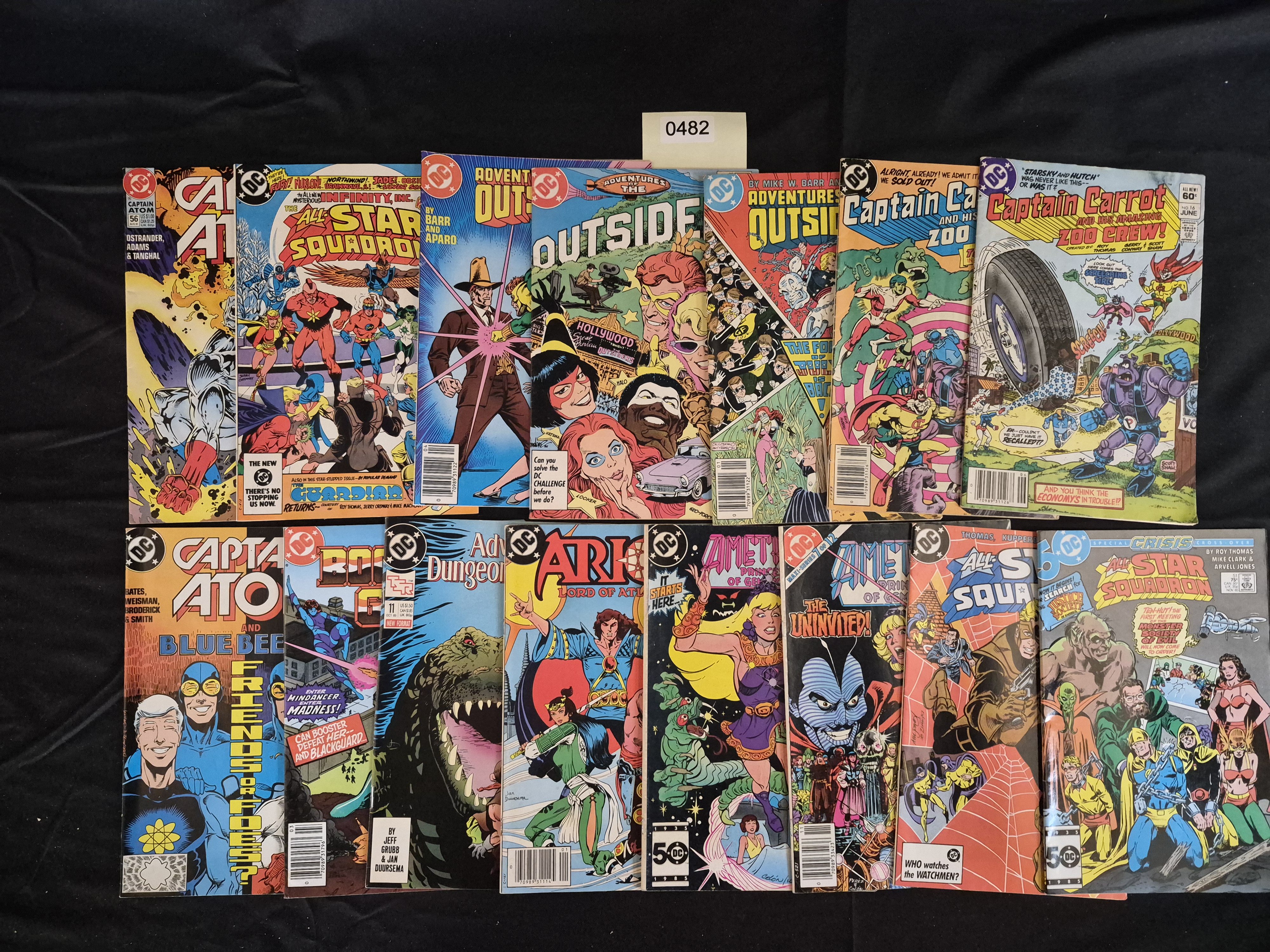 BID PER WHAT YOU SEE IN THE PHOTO, NOT THE AI GENERATED TITLES AND DESCRIPTIONS! A collection of 14 standard American comic books published by DC Comics, dating primarily from the Copper Age (1980s). The lot includes various titles such as Captain Atom, All-Star Squadron, Adventures of the Outsiders, Captain Carrot and His Amazing Zoo Crew!, Advanced Dungeons and Dragons, Arak: Lord of Alabaster, and Amethyst, Princess of Gemworld. Several issues display the DC 50th Anniversary logo (1935-1985), indicating publication around 1985. The covers are glossy, printed paper, featuring original cover prices ranging from approximately US $1.00 to $1.50, and visible barcodes. One issue of All-Star Squadron is noted as a Crisis Cross-Over. The collection is arranged in two rows of seven items each. A yellow adhesive note marked 0482 is present near the top center of the lot.