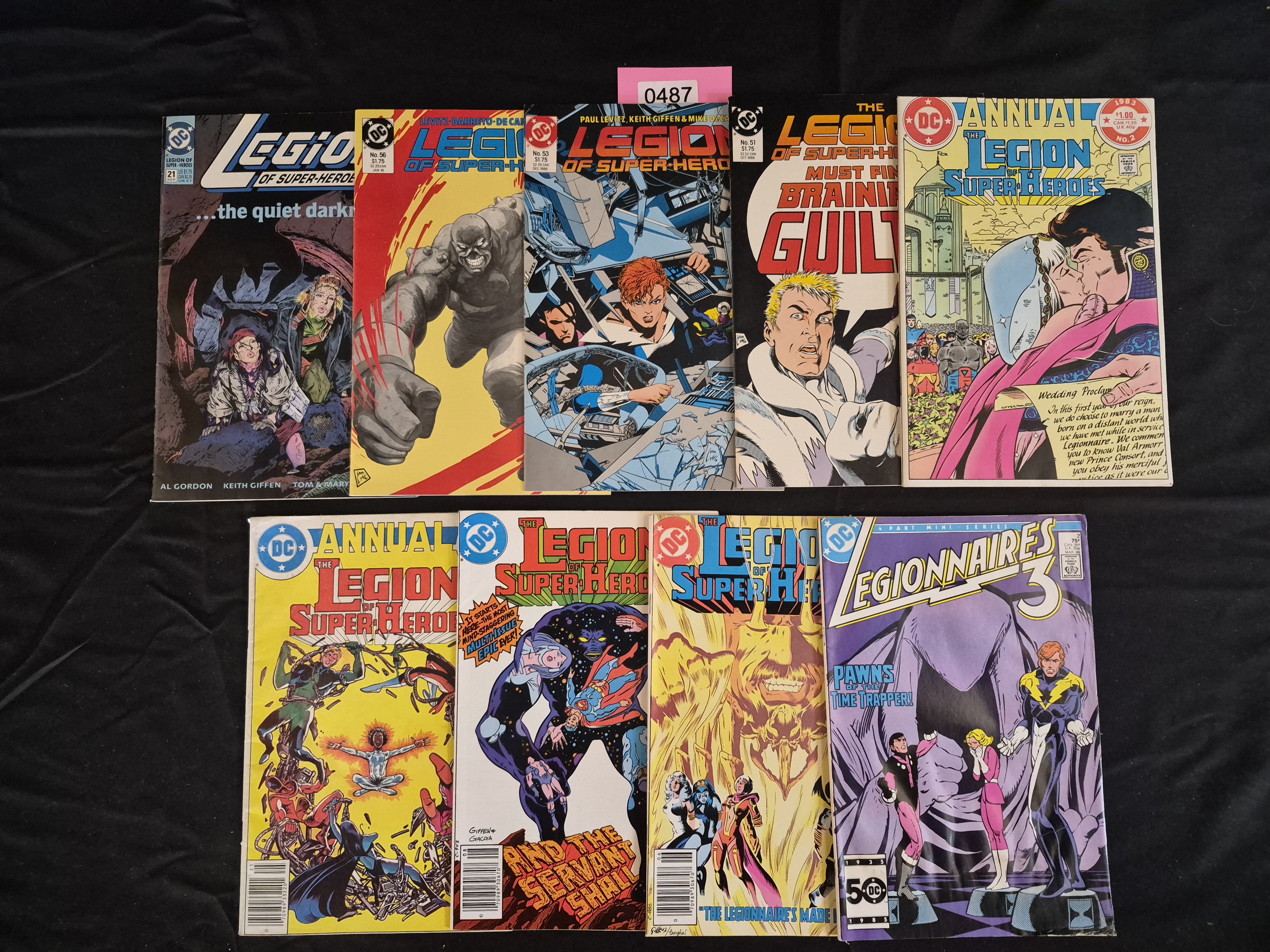 BID PER WHAT YOU SEE IN THE PHOTO, NOT THE AI GENERATED TITLES AND DESCRIPTIONS! A collection of 10 Modern Age DC comic books featuring the Legion of Super-Heroes. The collection includes titles from the main Legion of Super-Heroes series, two Legion of Super-Heroes Annuals, and one issue from the Legionnaires 3 mini-series. The comics are printed on standard paper stock with color covers. Specific visible issues include Legion of Super-Heroes #21 (August 1991), #56 (January 1989), #53 (December 1988), #51 (October 1988), The Legion of Super-Heroes Annual No. 2 (1983), and Legionnaires 3 No. 3 (March 1986). The collection spans publication dates primarily from the mid-1980s through the early 1990s. A pink rectangular adhesive label marked “0487” is affixed to the upper edge of one of the comic books (Legion of Super-Heroes #53).