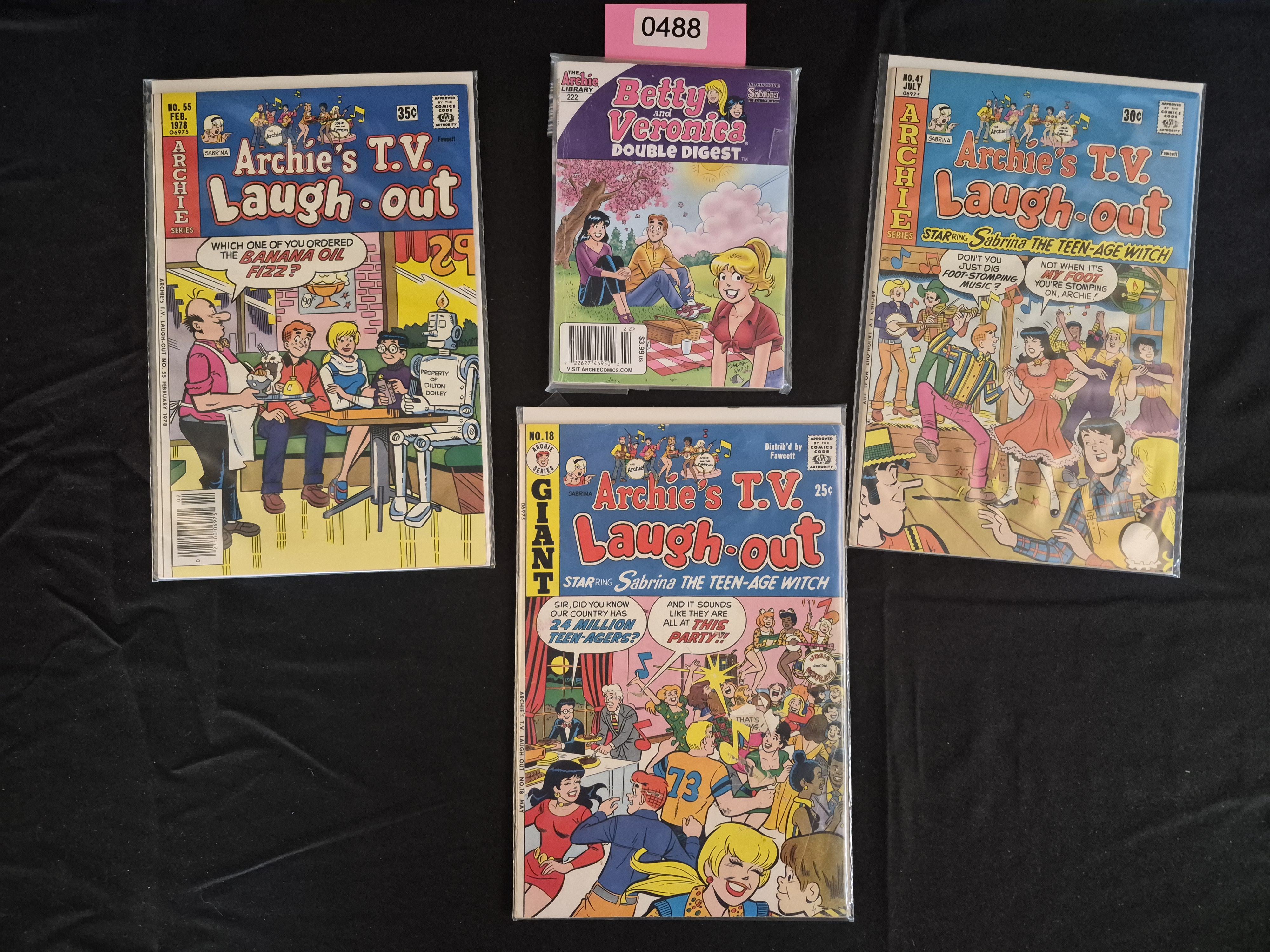 BID PER WHAT YOU SEE IN THE PHOTO, NOT THE AI GENERATED TITLES AND DESCRIPTIONS! A collection of four publications featuring characters from Archie Comics, published by Archie Publications. The lot includes three vintage-style comic books from the series Archie’s T.V. Laugh-Out and one modern digest. The three comic books bear the Comics Code Authority (CCA) seal and include: Issue No. 55 (February 1978, 35¢), Issue No. 41 (July, 30¢), and the oversized Giant Issue No. 18 (May, 25¢, distributed by Fawcett). All three vintage comics prominently feature Sabrina the Teen-Age Witch. The fourth item is a modern Betty and Veronica Double Digest (The Archie Library 222, priced $3.99 US), featuring a contemporary UPC barcode and protected within a clear plastic sleeve. The digest is associated with an inventory tag marked “0488.”