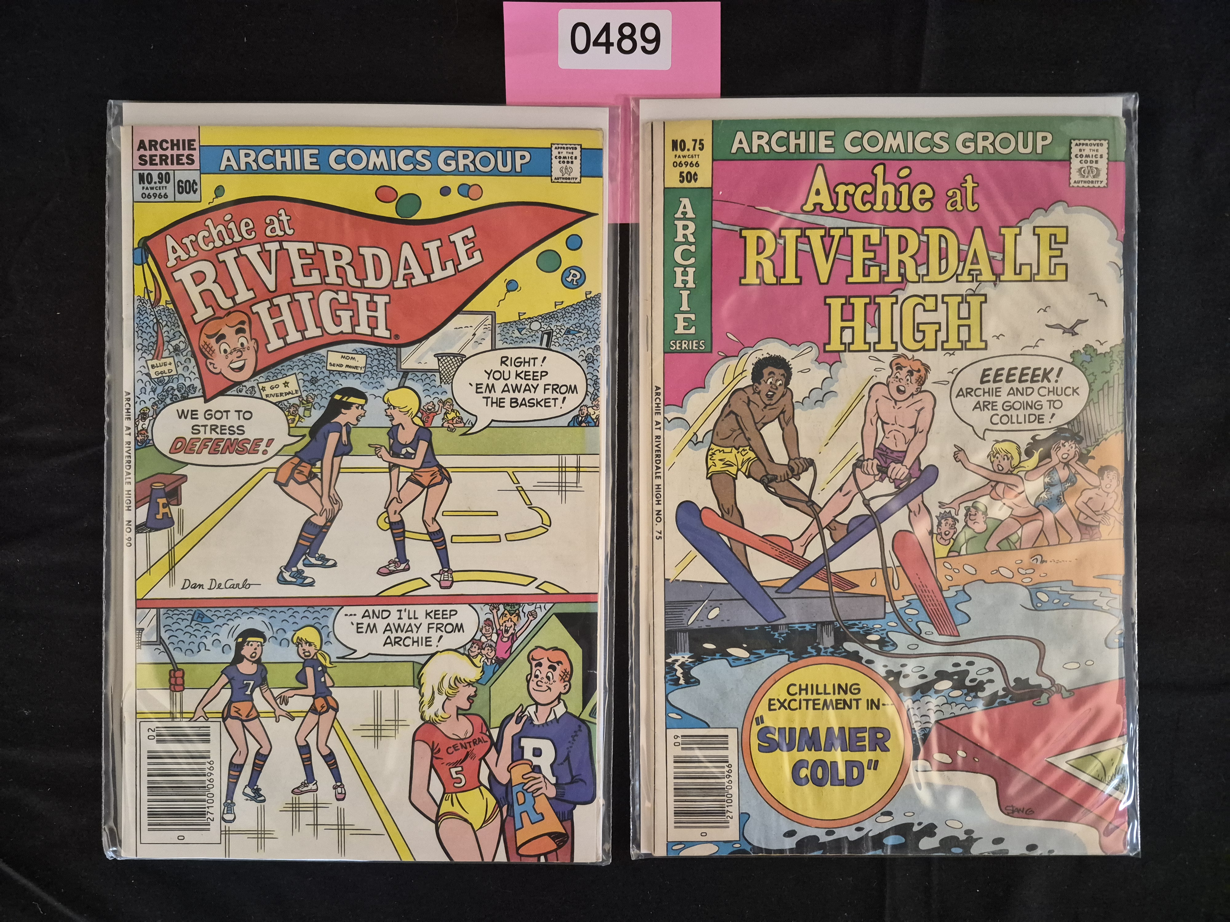 BID PER WHAT YOU SEE IN THE PHOTO, NOT THE AI GENERATED TITLES AND DESCRIPTIONS! A pair of vintage American comic books from the Archie Comics Group, Archie at Riverdale High series, dating to the Bronze Age of comics. The lot includes two distinct issues, both sealed within clear plastic sleeves. The first item is Issue No. 90, featuring a 60¢ cover price and displaying a basketball game cover scene, illustrated and signed by Dan DeCarlo. The second item is Issue No. 75, featuring a 50¢ cover price, depicting Archie and Chuck waterskiing with the featured story title “Chilling Excitement In— ‘Summer Cold'”. Both comics carry the Fawcett code 06966, display the Comics Code Authority seal, and include a vertical barcode (27100 06966). The artwork utilizes the colorful, traditional cartoon style common to the series.