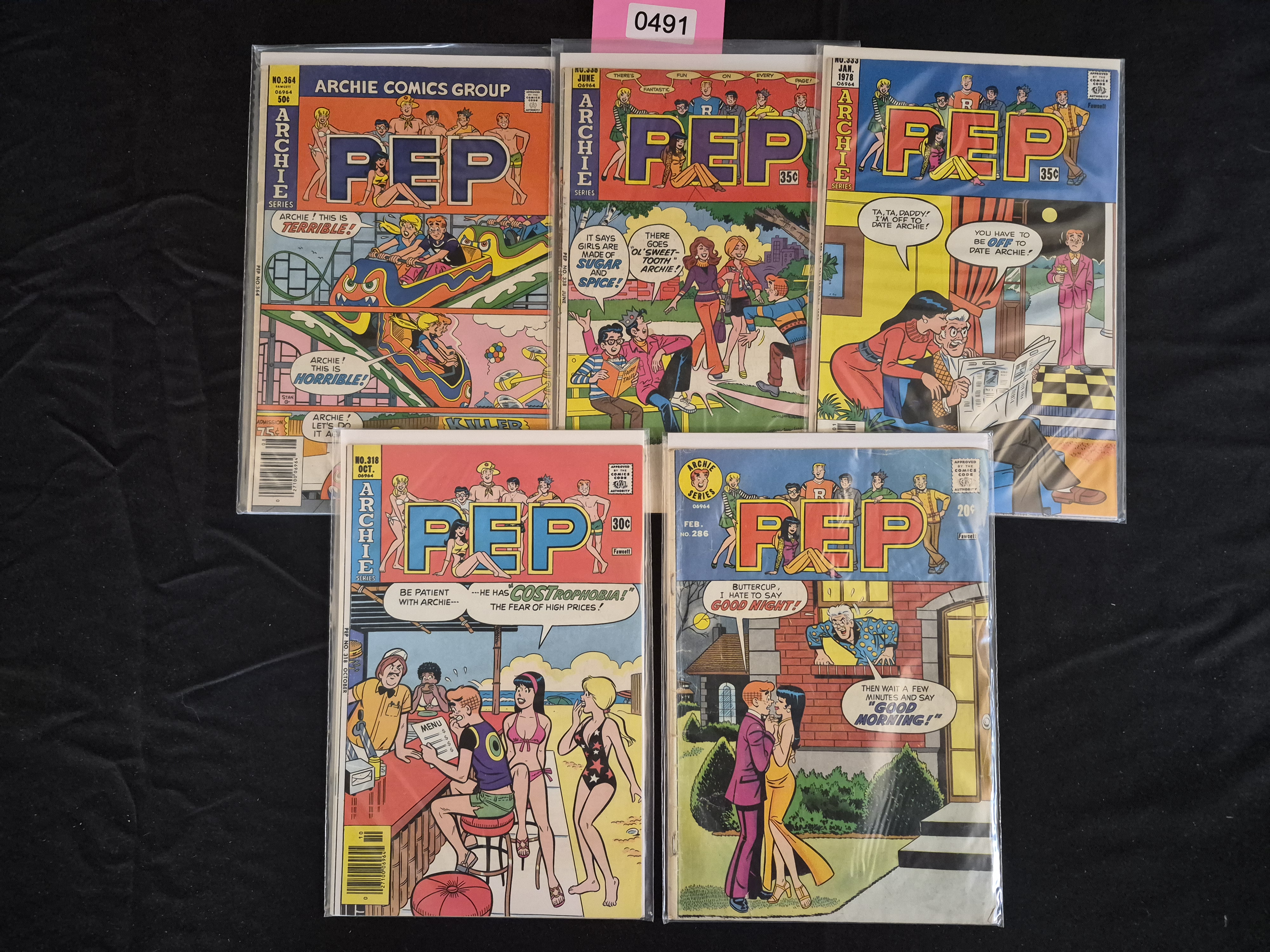 BID PER WHAT YOU SEE IN THE PHOTO, NOT THE AI GENERATED TITLES AND DESCRIPTIONS! A collection of five American comic books from the Archie Comics Group title Pep Comics, published during the Bronze Age (c. 1970s-1980s). The issues feature classic cartoon style artwork depicting the main characters, including Archie, Betty, and Veronica. Each comic book bears the “Approved by the Comics Code Authority” stamp. The collection includes the following specific issues and original cover prices: No. 286 (Feb., 20¢), No. 318 (Oct., 30¢), No. 333 (Jan. 1978, 35¢), No. 338 (June, 35¢), and No. 364 (50¢). The comics are constructed of paper and cardstock covers and are currently protected in clear plastic sleeves.