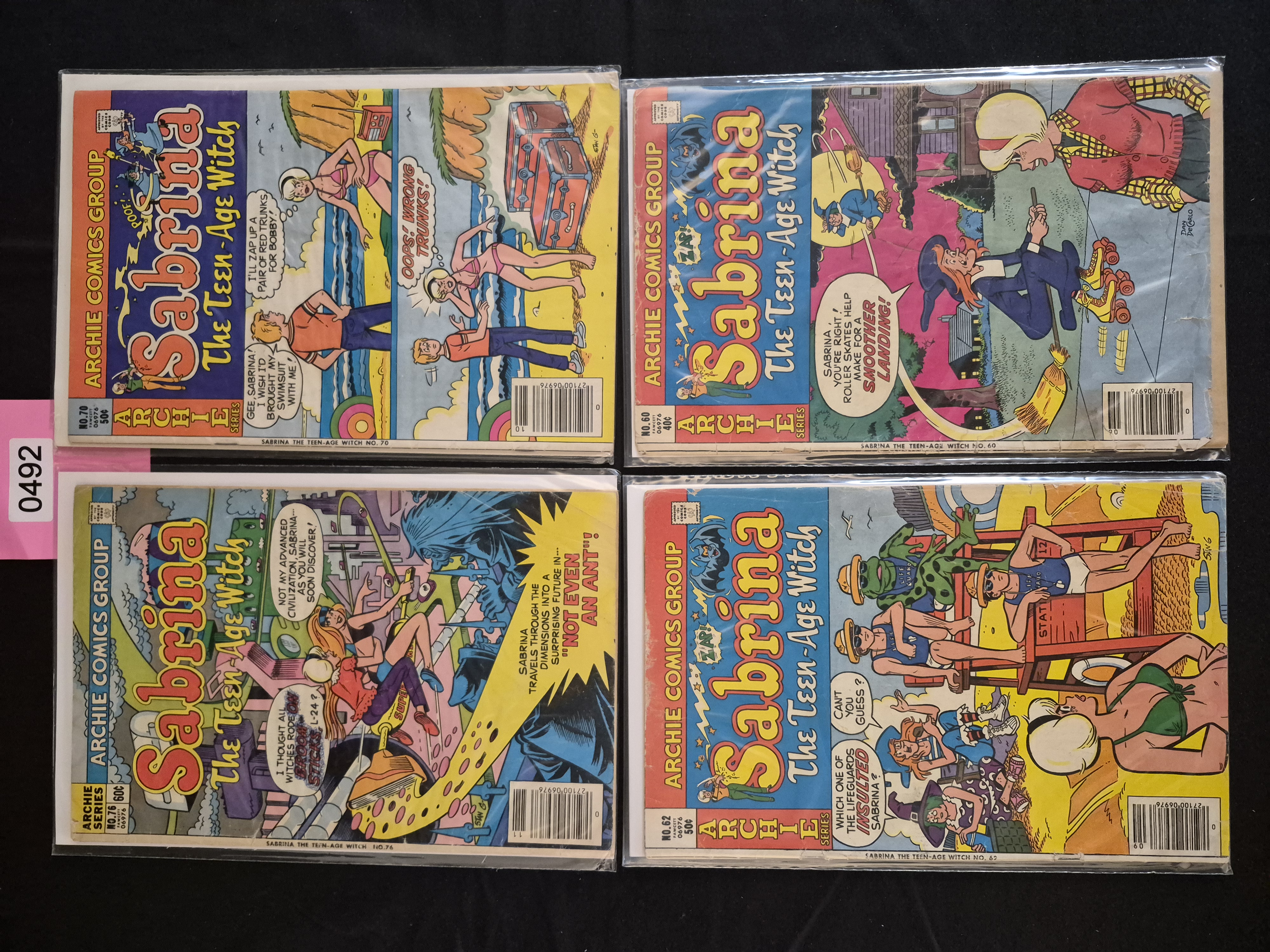 BID PER WHAT YOU SEE IN THE PHOTO, NOT THE AI GENERATED TITLES AND DESCRIPTIONS! A collection of four vintage American comic books from the Sabrina The Teen-Age Witch series, published by the Archie Comics Group. These issues date from the late Bronze Age to the early Modern Age, spanning cover prices from 40 cents to 60 cents. The lot includes issue numbers 76 (60 cent cover price, featuring a barcode), 70 (50 cent cover price), 62 (50 cent cover price), and 60 (40 cent cover price). All comics are standard size, printed in color on paper. Issue No. 60 features cover art signed by Dan DeCarlo. Three of the four issues display the Approved by the Comics Code Authority seal, and all feature the Archie Series label. The comics are individually enclosed in clear protective plastic sleeves.