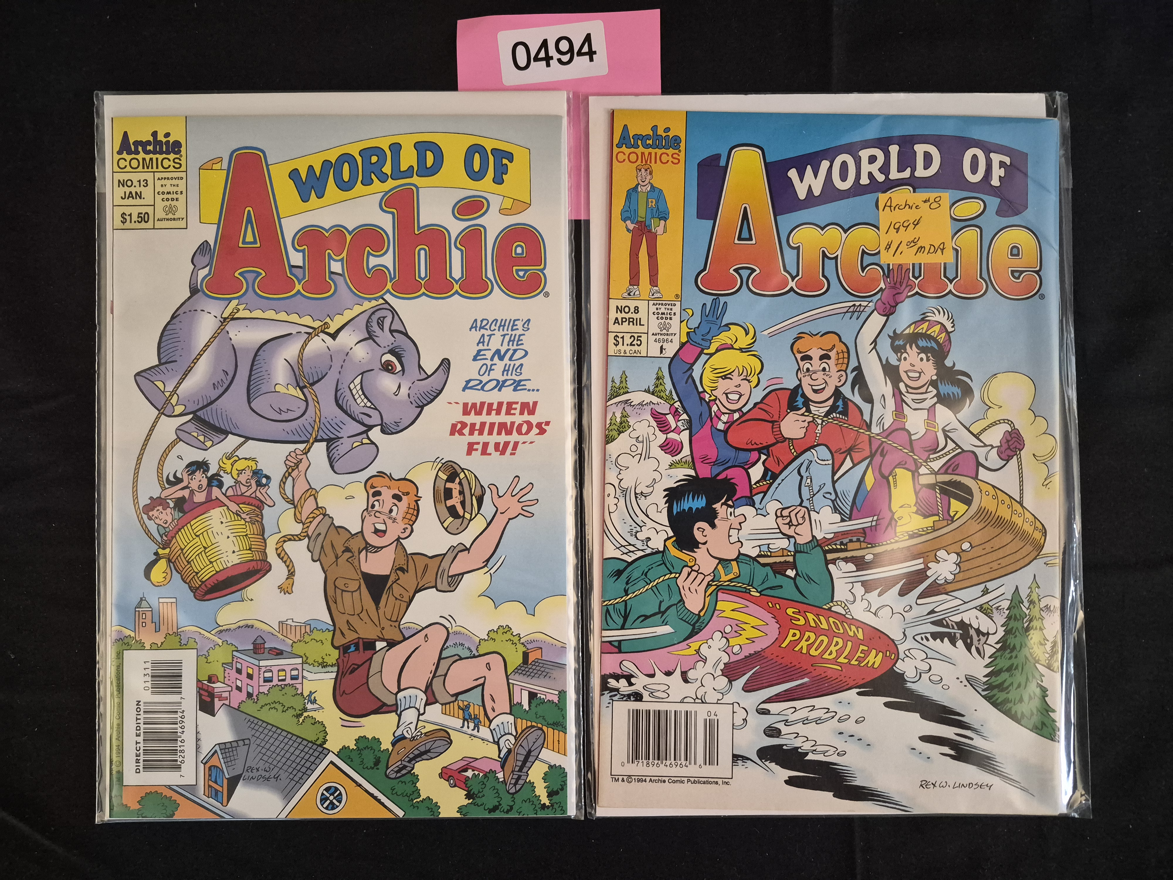 BID PER WHAT YOU SEE IN THE PHOTO, NOT THE AI GENERATED TITLES AND DESCRIPTIONS! A pair of Modern Age paperback comic books published by Archie Comics, both from the series World of Archie. The lot consists of two issues published in 1994. The first issue is No. 13 (January, cover price $1.50), featuring the story “WHEN RHINOS FLY!” and displaying a Direct Edition barcode. The second issue is No. 8 (April, cover price $1.25), featuring the story “SNOW PROBLEM.” Both comics feature the standard American cartoon art style associated with the franchise and bear the Comics Code Authority seal. The copyright date of 1994 is visible near the barcodes, confirming their publication period.