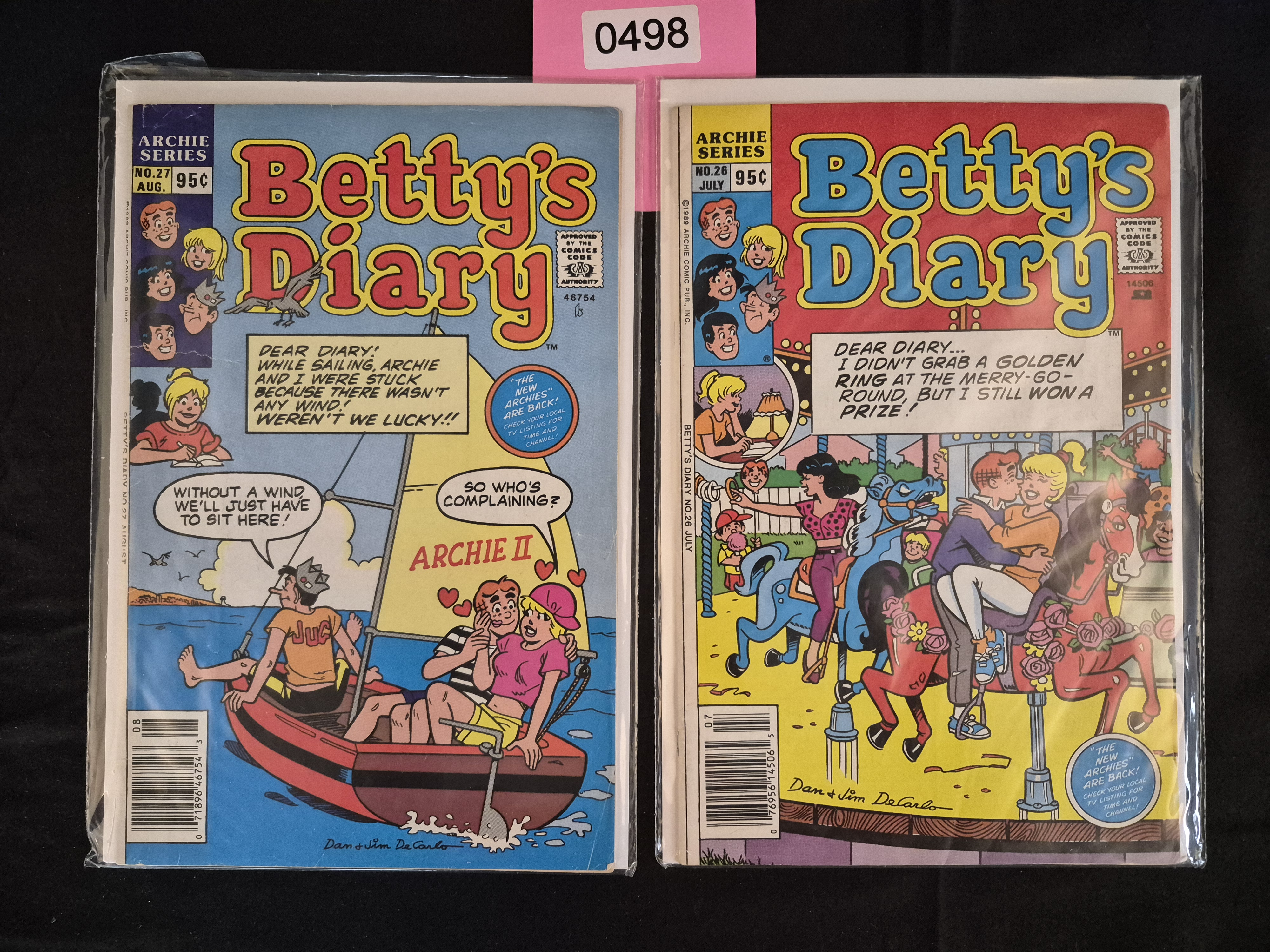 BID PER WHAT YOU SEE IN THE PHOTO, NOT THE AI GENERATED TITLES AND DESCRIPTIONS! A pair of comic books from the Archie Series title Betty’s Diary, published by Archie Comics Publications, Inc. The lot includes Issue No. 26 (July) and Issue No. 27 (August), both dated 1989. Both covers feature illustrations signed by Dan and Jim DeCarlo and bear the 95¢ price stamp and the Approved by the Comics Code Authority seal. Issue No. 27 depicts Betty and Archie on a sailboat, while Issue No. 26 shows Betty and Veronica riding a carousel. Both covers also feature a circular advertisement promoting “The New Archies” television show. The comics are presented in protective plastic sleeves.