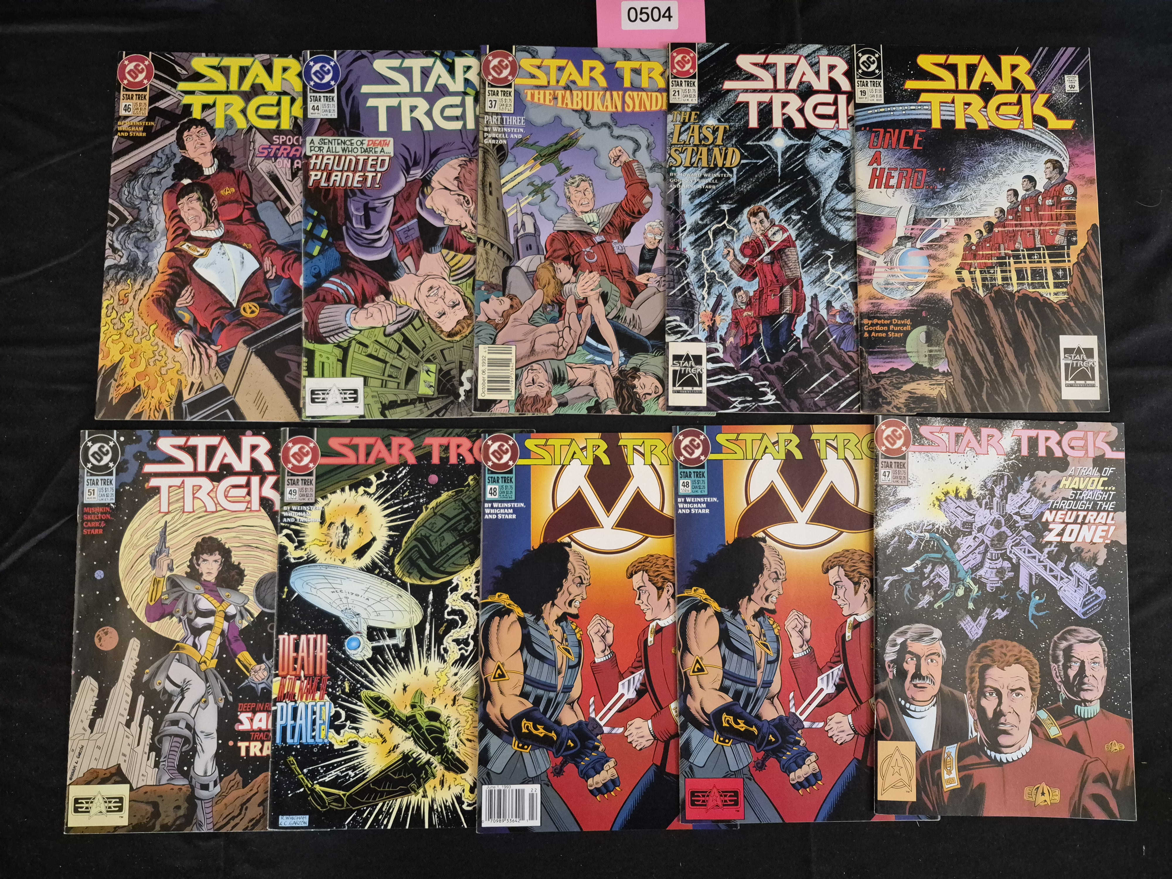 BID PER WHAT YOU SEE IN THE PHOTO, NOT THE AI GENERATED TITLES AND DESCRIPTIONS! A collection of 12 vintage periodicals from the DC Comics Star Trek series, published primarily during the late 1980s and early 1990s, corresponding to the New Format run (1984-1996). The comics feature full-color paper covers depicting action scenes involving characters and spacecraft from the Original Series films era. Visible issue numbers range from approximately #19 through #51. Titles observed include A Haunted Planet, The Tabukan Synd(icate), The Last Stand, A Trail of Havoc, and Once a Hero. Each item bears the circular DC Comics logo and original cover pricing information, typically US $1.75 / CAN $2.25. The collection is presented in two rows of six.