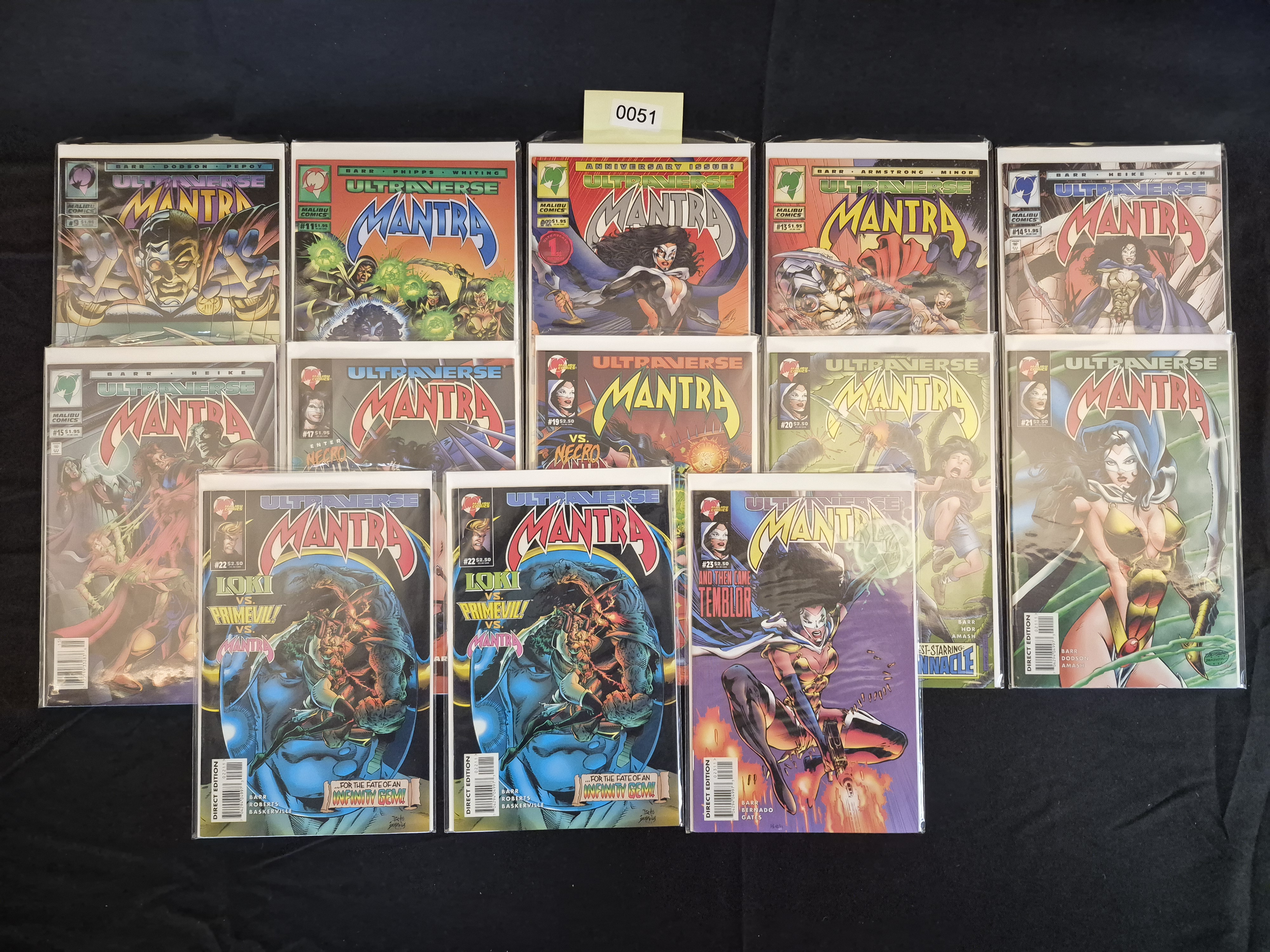 BID PER WHAT YOU SEE IN THE PHOTO, NOT THE AI GENERATED TITLES AND DESCRIPTIONS! A collection of 14 Modern Age comic books from the Malibu Comics Ultraverse imprint, specifically the Mantra series. The lot includes a consecutive run of issues from #9 through #18, along with issues #22 (two copies), #23, and #24. The books feature colorful fantasy and superhero cover art and are individually protected within clear plastic sleeves with white backing boards. Visible original retail prices are marked as $1.95 or $2.50 USD. Many copies are identified as Direct Edition printings. A numerical sticker reading 0051 is affixed to the plastic sleeve of the center comic book in the top row.
