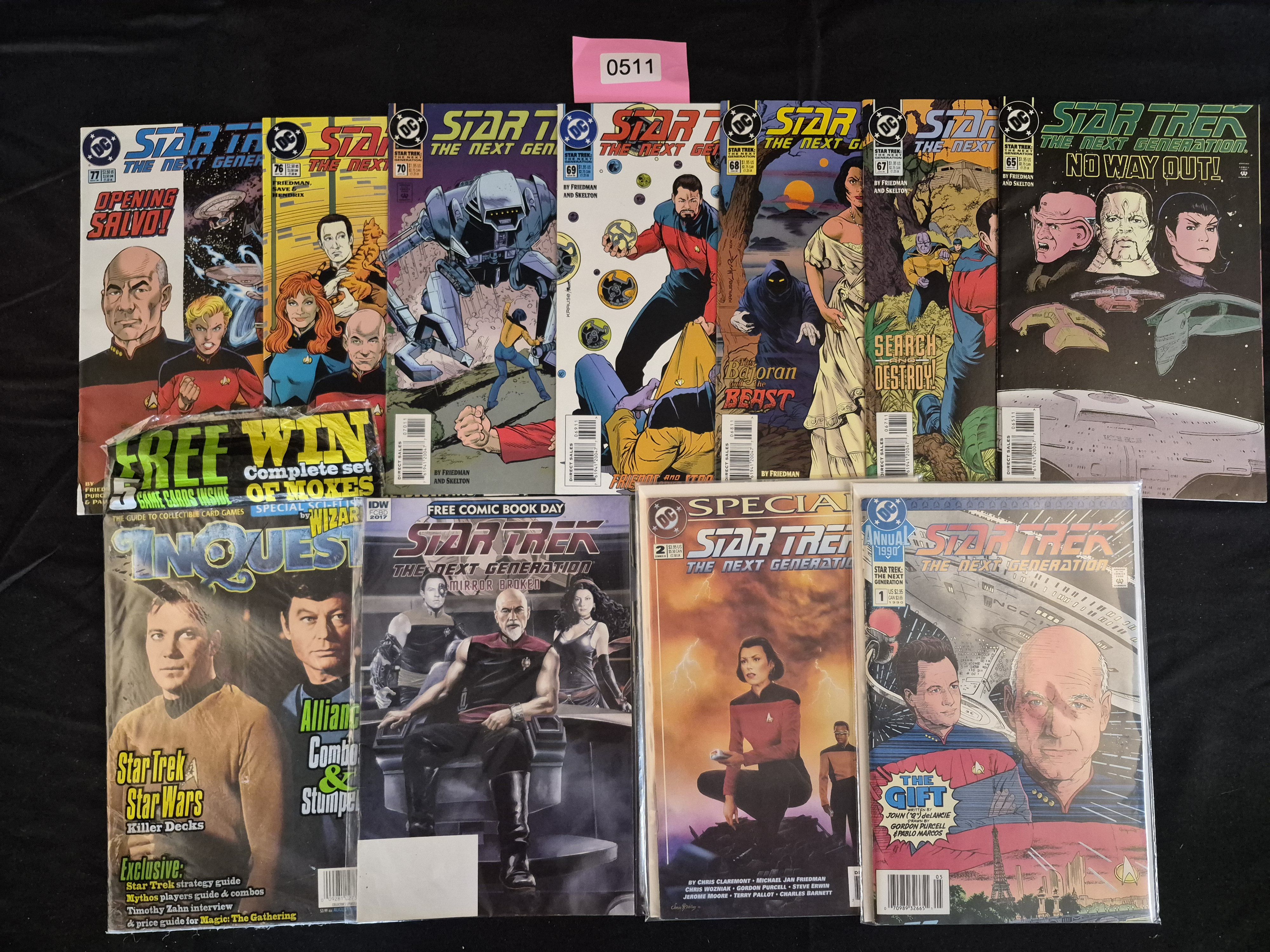 BID PER WHAT YOU SEE IN THE PHOTO, NOT THE AI GENERATED TITLES AND DESCRIPTIONS! A collection of 13 mixed-format print publications primarily focused on the Star Trek: The Next Generation franchise. The collection is largely composed of standard comic books published by DC Comics, consistent with the identified run of Star Trek TNG comics. The lot includes 9 standard DC Comics issues, visibly including numbers from the 60s and 70s range (such as #65, #66, #67, #68, #69, #70, #76, and #77). Additionally, the collection contains 4 larger-format periodicals. These include a DC Comics Star Trek: The Next Generation Annual #1 (1990), a DC Comics Star Trek: The Next Generation Special #2, an IDW Publishing Free Comic Book Day issue (2017) titled ‘Mirror Broken,’ and one copy of *InQuest* strategy magazine, which focuses on collectible card games and features Star Trek and Star Wars content. All publications feature full-color covers depicting various characters and starships from the television series.