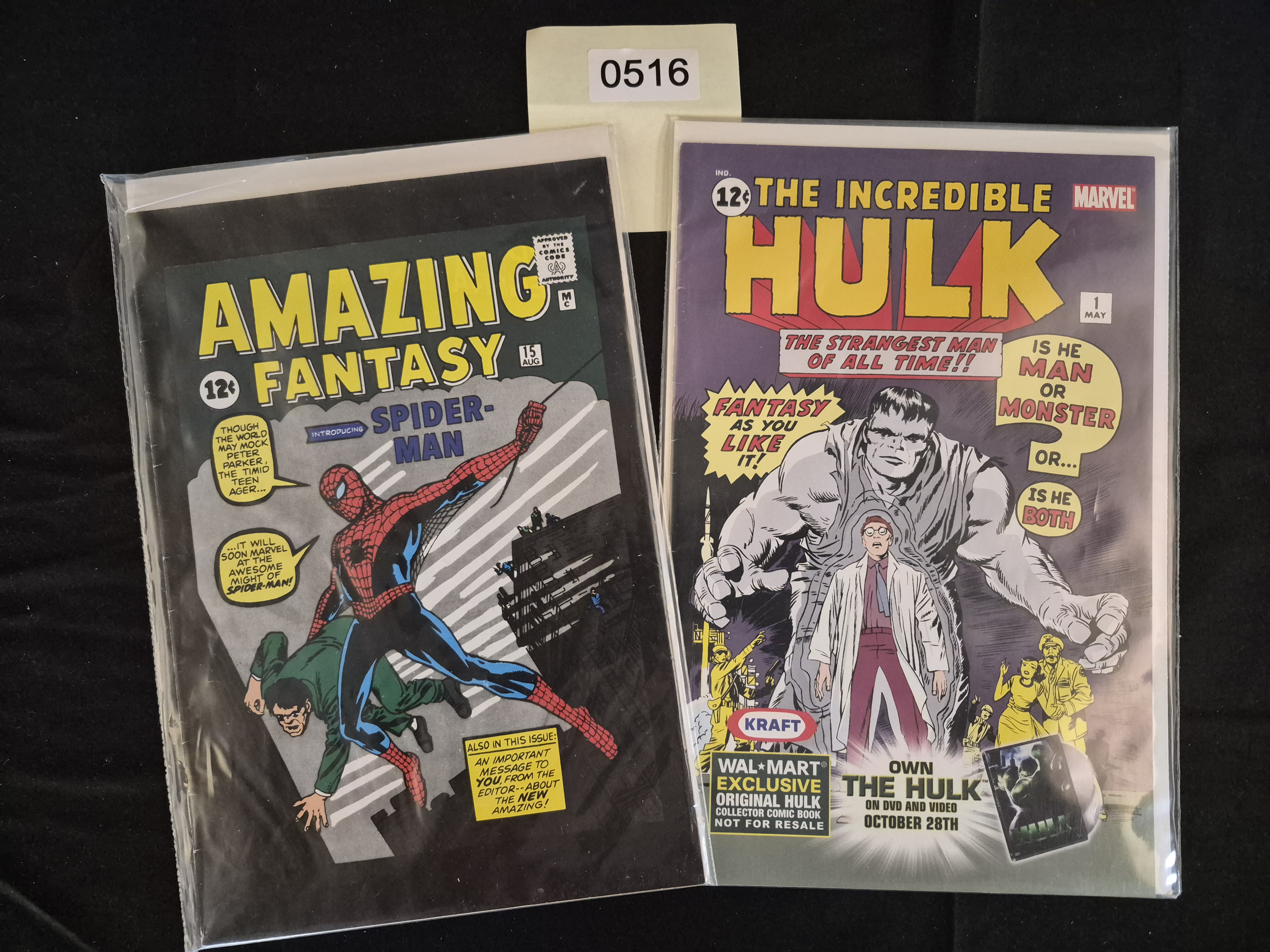 BID PER WHAT YOU SEE IN THE PHOTO, NOT THE AI GENERATED TITLES AND DESCRIPTIONS! A pair of modern comic book reprints featuring key Silver Age Marvel issues. The lot includes two items, each presented in a clear plastic sleeve with a backing board. The first item is a reprint of Marvel Comics’ Amazing Fantasy #15 (August), featuring the first appearance of Spider-Man. This copy displays the original 12 cent cover price and the Comics Code Authority seal. The second item is a promotional reprint of Marvel Comics’ The Incredible Hulk #1 (May). This copy also displays the original 12 cent cover price but features prominent modern promotional markings including the KRAFT logo and a label identifying it as a WAL-MART EXCLUSIVE ORIGINAL HULK COLLECTOR COMIC BOOK NOT FOR RESALE. This promotional issue was distributed in relation to the 2003 DVD and Video release of The Hulk film. Both items are modern reproductions of classic 1960s comic book covers.