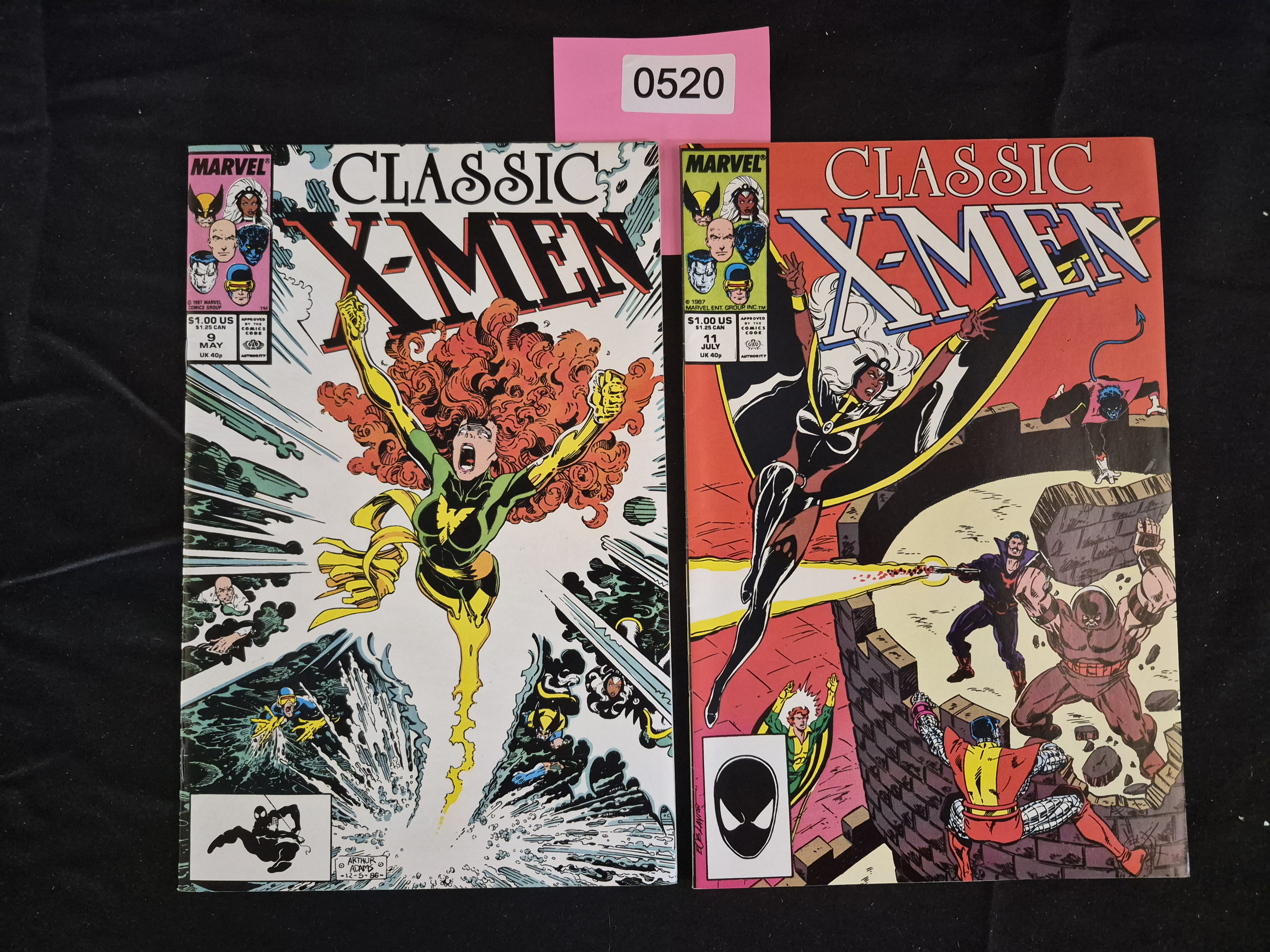 BID PER WHAT YOU SEE IN THE PHOTO, NOT THE AI GENERATED TITLES AND DESCRIPTIONS! A pair of comic books from the Classic X-Men series, published by Marvel Comics Group in 1987. The lot consists of two specific issues printed on paper. The first item is Classic X-Men Issue #9, dated May 1987, featuring Jean Grey (Phoenix) prominently on the cover. This issue displays the Comics Code Authority seal and a cover price of $1.00 US. The second item is Classic X-Men Issue #11, dated July 1987, featuring a cover illustration of Storm, Nightcrawler, Colossus, and Juggernaut against a red background. This issue also displays the Comics Code Authority seal and a cover price of $1.00 US. Both comics feature the classic X-Men roster heads in the upper left corner and include black Symbiote Spider-Man graphics in their respective price/UPC boxes.