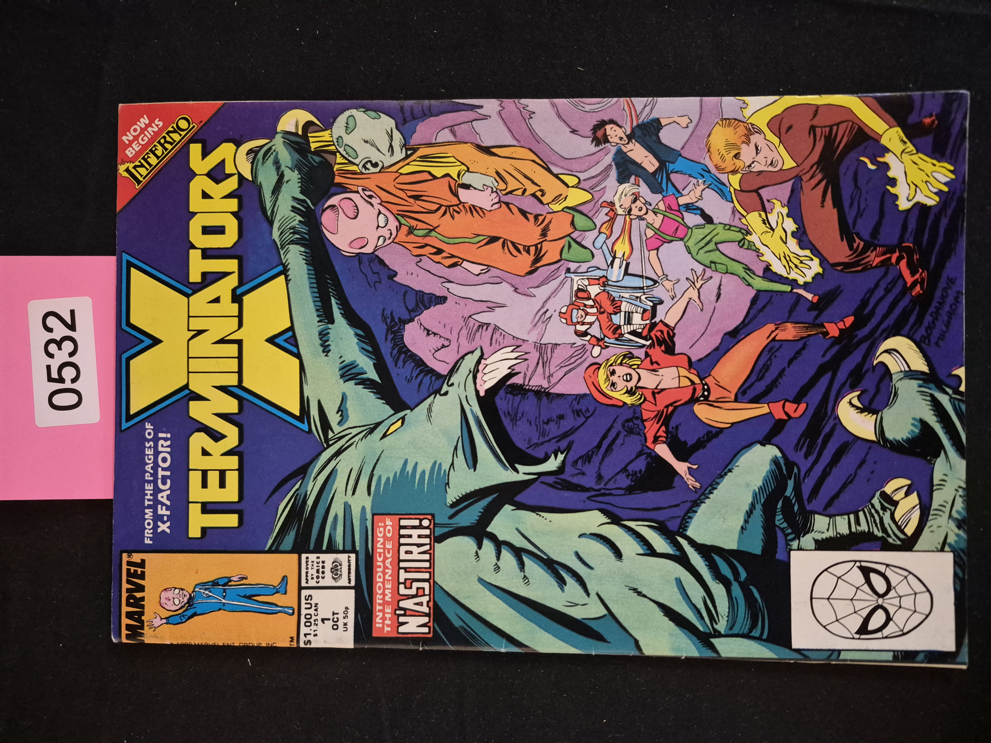 BID PER WHAT YOU SEE IN THE PHOTO, NOT THE AI GENERATED TITLES AND DESCRIPTIONS! A single issue of the Marvel Comics title X-Terminators, Issue No. 1, dated October 1988. This comic book initiates the “INFERNO” crossover event and features the first appearance of the demon N’Astirh. The cover art is credited to Bogdanove and Milgrom, depicting the central demonic figure towering over the young mutant characters. The cover displays the $1.00 US price, the Comics Code Authority seal, the Spider-Man mask corner box logo, and the text “FROM THE PAGES OF X-FACTOR!”.