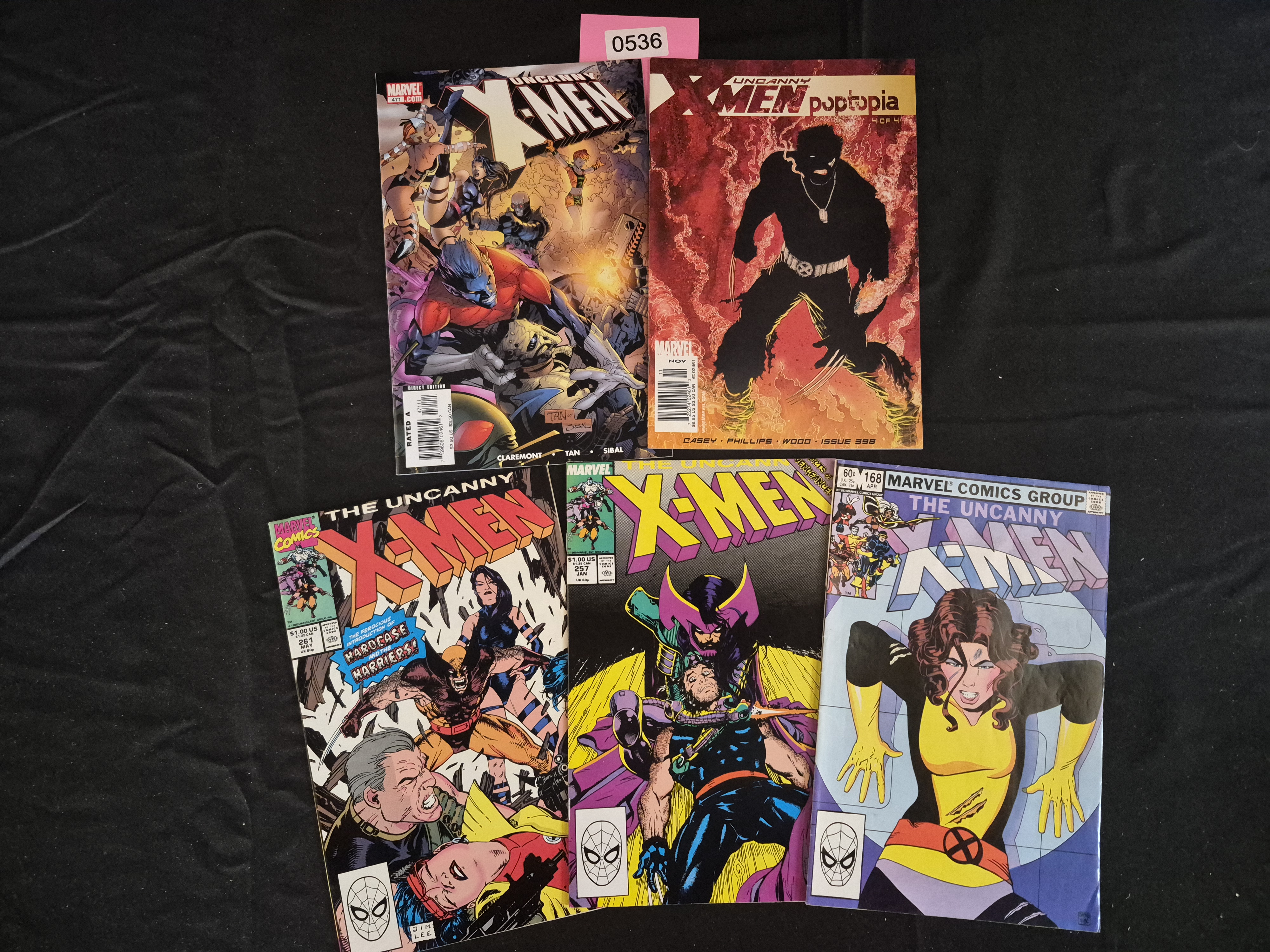 BID PER WHAT YOU SEE IN THE PHOTO, NOT THE AI GENERATED TITLES AND DESCRIPTIONS! A collection of five Marvel X-Men comic books, constructed of paper, spanning titles and eras from the 1980s through the 2000s. The lot includes issues from both *The Uncanny X-Men* and *X-Men* series published by Marvel Comics. Specific issues present are *The Uncanny X-Men* #168 (60¢ cover price, featuring Kitty Pryde), *The Uncanny X-Men* #251 ($1.25 cover price, featuring art by Jim Lee), *X-Men* #2 ($1.00 cover price), *Uncanny X-Men Poptopia* #398 (Part 4 of 4, $2.25 cover price), and *Uncanny X-Men* #471 (Rated A, $2.50 cover price). The Web Intelligence report confirms market interest in *Uncanny X-Men* #398, identified as the “Poptopia Part 4” storyline.