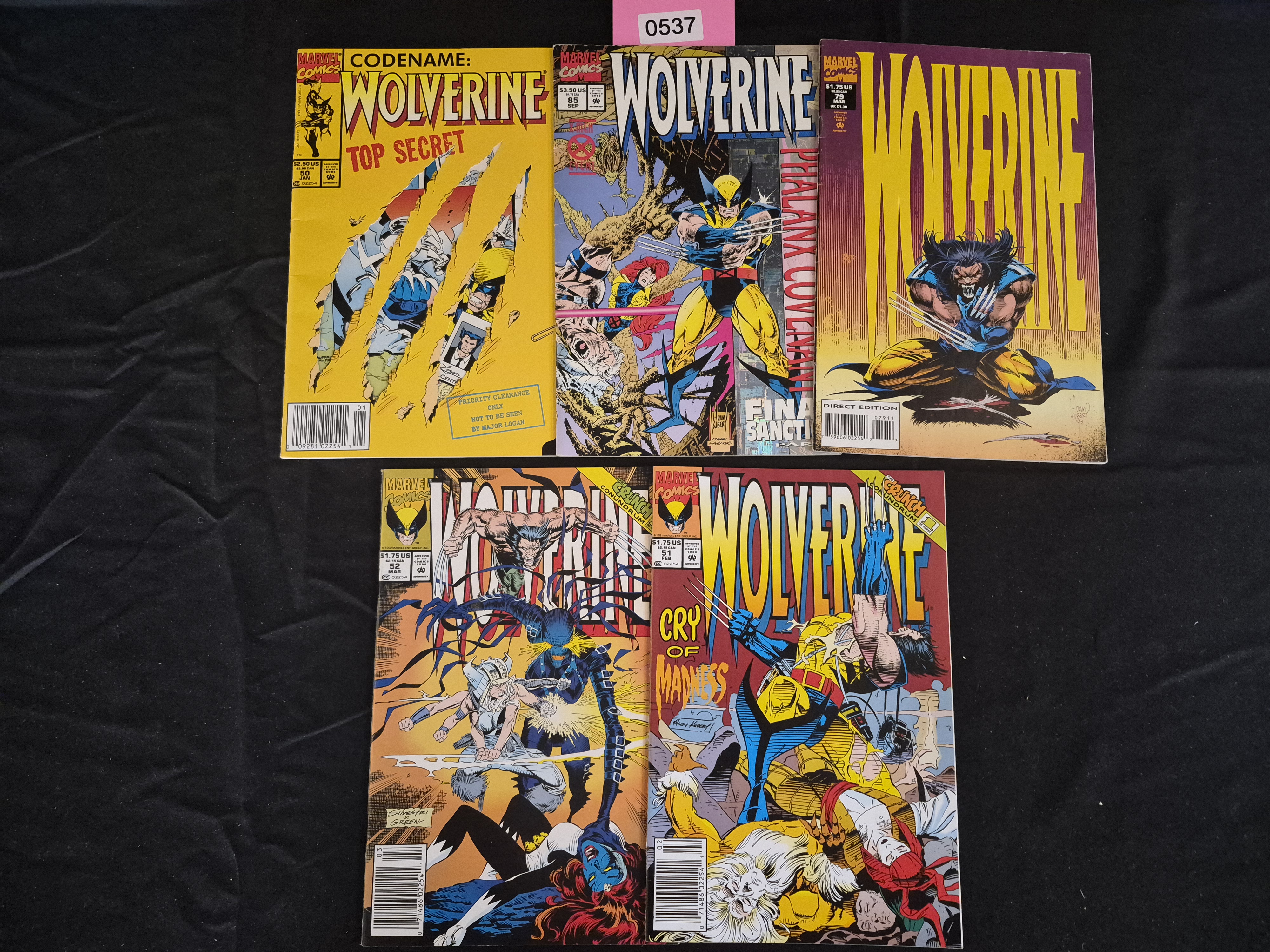 Identifiable issues include Wolverine #75, featuring a die-cut yellow cover and the title "Codename: Wolverine: Top Secret, " marked "PRIORITY CLEARANCE ONLY NOT TO BE SEEN BY MAJOR LOGAN." Also present are issue #85 (a Phalanx Covenant crossover), issue #79, issue #52, and issue #51, which is labeled as "The Crunch Conundrum" part 1. One additional issue is included in the lot.