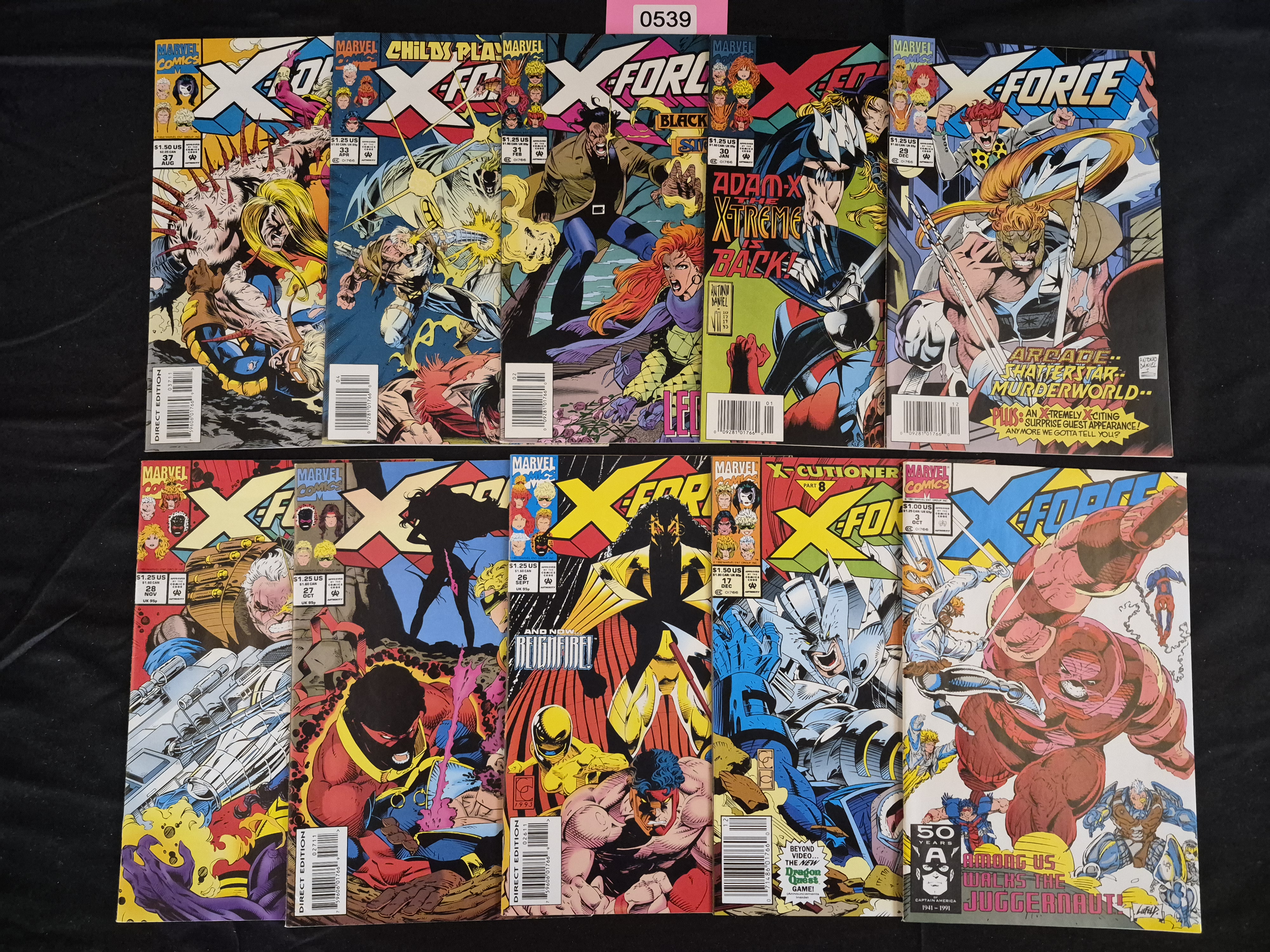 BID PER WHAT YOU SEE IN THE PHOTO, NOT THE AI GENERATED TITLES AND DESCRIPTIONS! A collection of twelve (12) American comic books published by Marvel Comics under the title X-Force, dating primarily from the early to mid-1990s, consistent with the Modern Age of comics. The lot includes key issues such as #3 (featuring the Juggernaut), #12, #17 (X-Cutioner Part 8), and a substantial run of issues from #25 through #33, concluding with issue #37. Visible storylines and featured text include Childs Play, Adam-X the X-Treme is Back, and Among Us Walks the Juggernaut. The comics feature the bold, action-oriented artwork characteristic of the era. All copies observed are marked as “DIRECT EDITION” and display original cover prices ranging from $1.00 to $1.50 US. The collection is sold as a single lot.