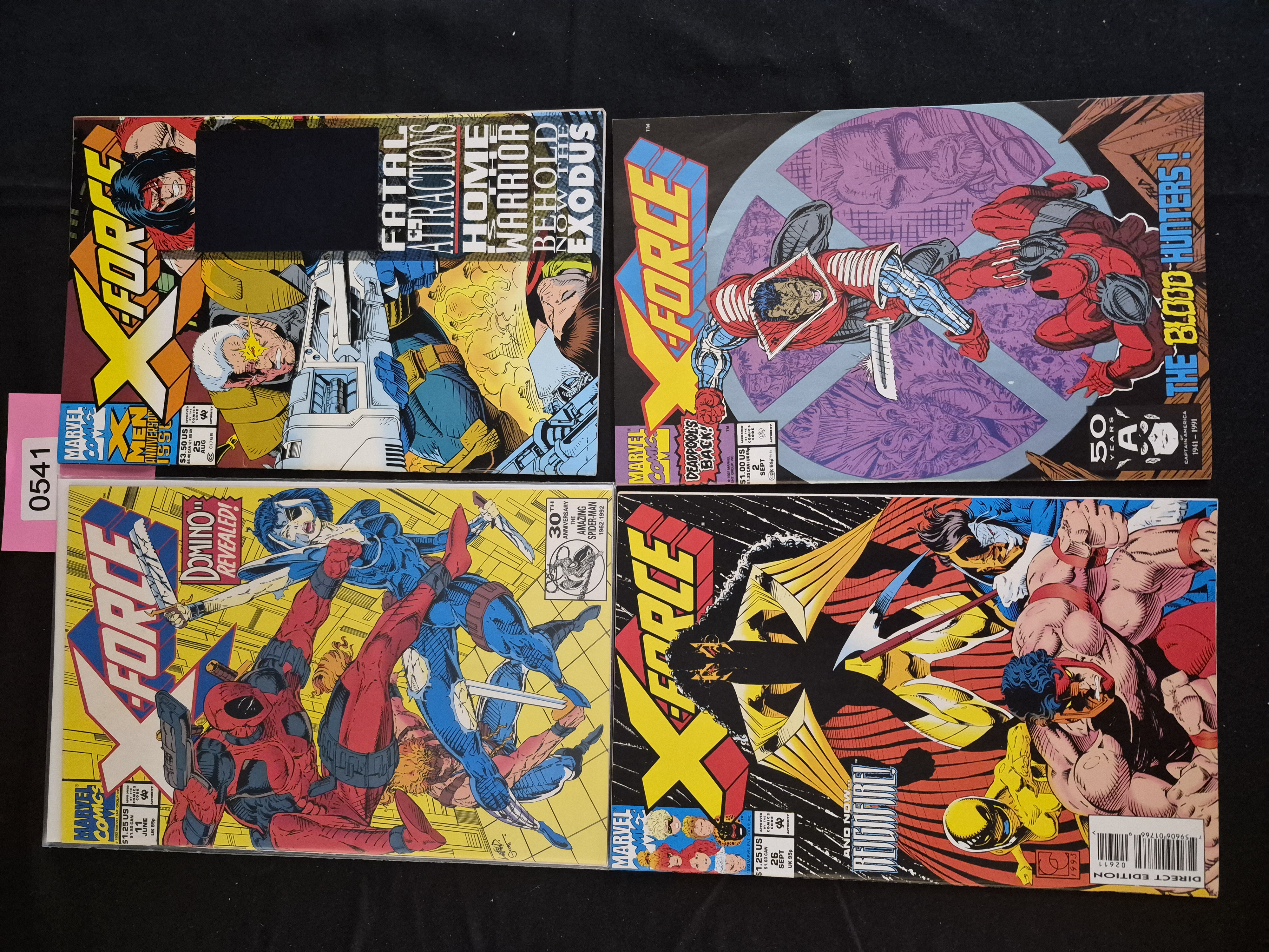 BID PER WHAT YOU SEE IN THE PHOTO, NOT THE AI GENERATED TITLES AND DESCRIPTIONS! The collection consists of four Modern Age American comic books from the Marvel Comics series X-Force, published by Marvel Comics between 1991 and 1993. Key characters featured prominently across the covers include Cable, Deadpool, and Domino. All comics are presented in full color on glossy paper and are housed flat in protective plastic sleeves. At least one issue (#26) is confirmed as a Direct Edition, and the others appear consistent with Direct Edition printing. The collection includes the following issues: Issue #2 (September 1991, $1.00 US), featuring the 50th Anniversary of Captain America and the text Deadpool’s Back!; Issue #11 (June 1992, $1.25 US), which features the 30th Anniversary of Spider-Man, the text Domino Revealed!, and is noted in market intelligence for the 1st team appearance of Weapon P.R.I.M.E. and the 2nd appearance of the real Domino (Neena Thurman); Issue #25 (August 1993, $3.50 US), an X-Men Anniversary Issue tied to the Fatal Attractions storyline; and Issue #26 (September 1993, $1.25 US), featuring the text And Now… Reignfire!.