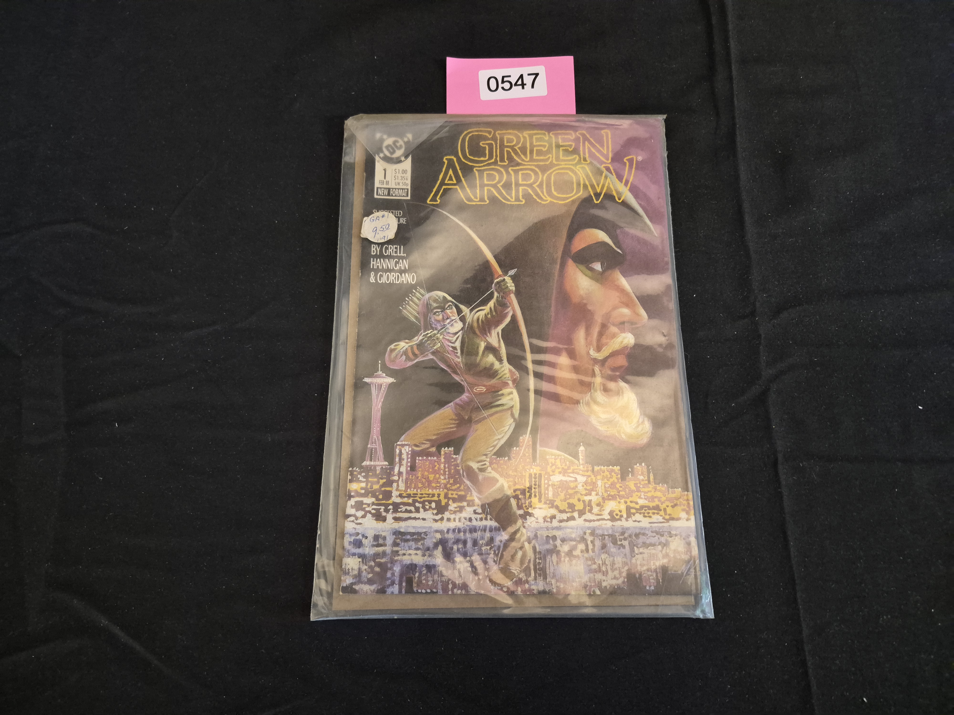 BID PER WHAT YOU SEE IN THE PHOTO, NOT THE AI GENERATED TITLES AND DESCRIPTIONS! A single American comic book periodical, Green Arrow, Issue #1, published by DC Comics in February 1988 (FEB 88). This issue marked the start of the 1987/88 series relaunch, featuring the NEW FORMAT designation visible on the cover. The creative team is credited as Mike Grell (writer/artist), Ed Hannigan, and Dick Giordano. The cover art depicts Green Arrow drawing a bow over a cityscape featuring the Seattle Space Needle. The comic is currently protected in a clear plastic sleeve with a backing board. Visible markings include the DC logo, the original price of $1.00 USD, a pink auction tag labeled 0547 affixed to the sleeve, and a circular handwritten notation on the lower left of the cover reading GA#1 9.50.