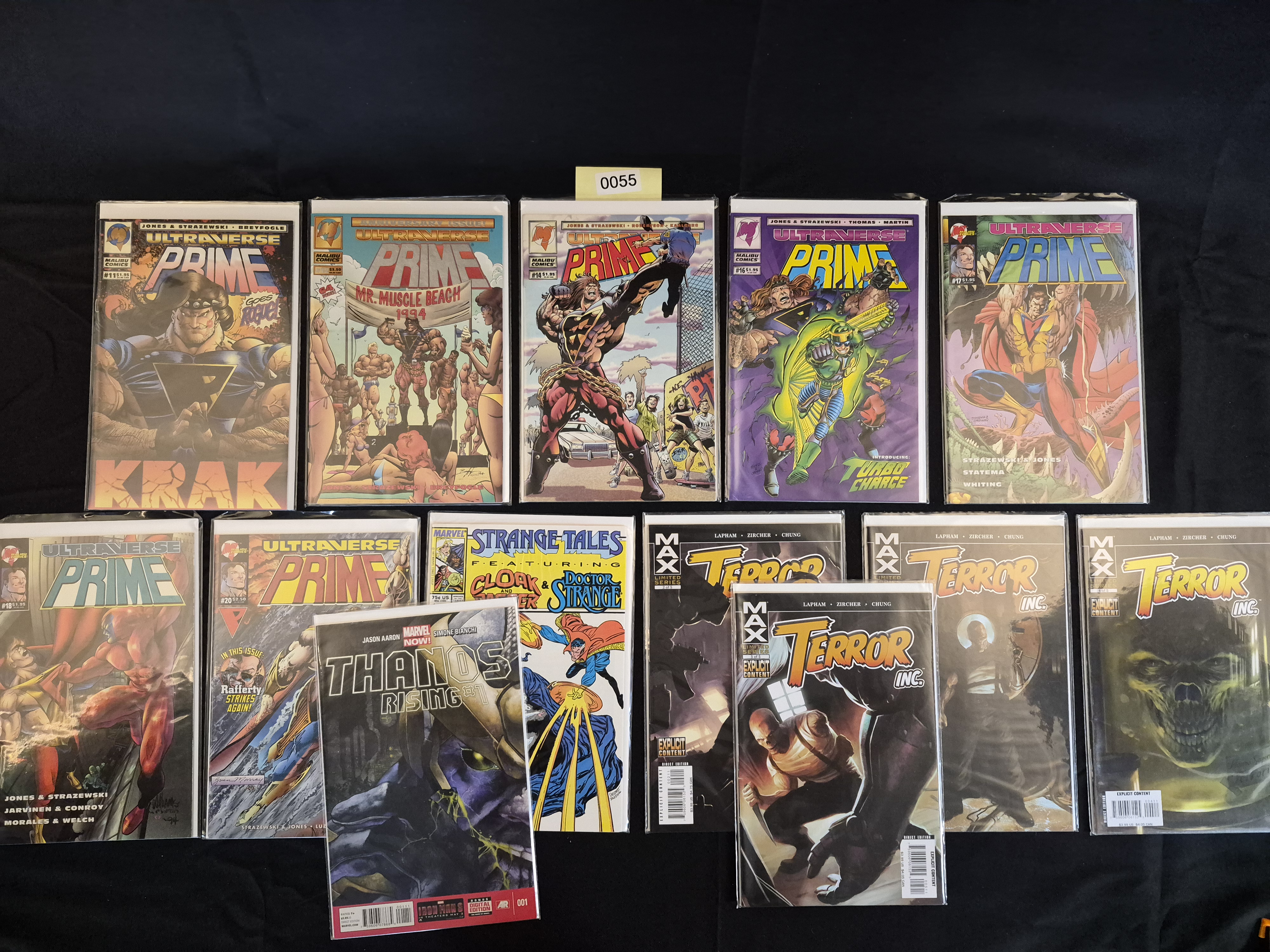 BID PER WHAT YOU SEE IN THE PHOTO, NOT THE AI GENERATED TITLES AND DESCRIPTIONS! A collection of 14 modern comic books from the 1990s and 2000s, consisting primarily of Malibu Comics Ultraverse titles and various Marvel Comics publications. The lot includes eight issues of Malibu Comics Ultraverse Prime (issues #11, #14, #15, #16, #17, #18, #20, and one additional issue, likely #28). The remaining six books are Marvel publications, including the key modern issue Thanos Rising #1 (Marvel Now!), one issue of Strange Tales featuring Cloak and Doctor Strange (75c cover price), and four sequential issues of the mature readers Terror Inc. MAX Limited Series (Issues 2, 3, 4, and 5 of 5). The comics are individually protected in clear plastic sleeves. A yellow adhesive note marked 0055 is visible within the lot arrangement.