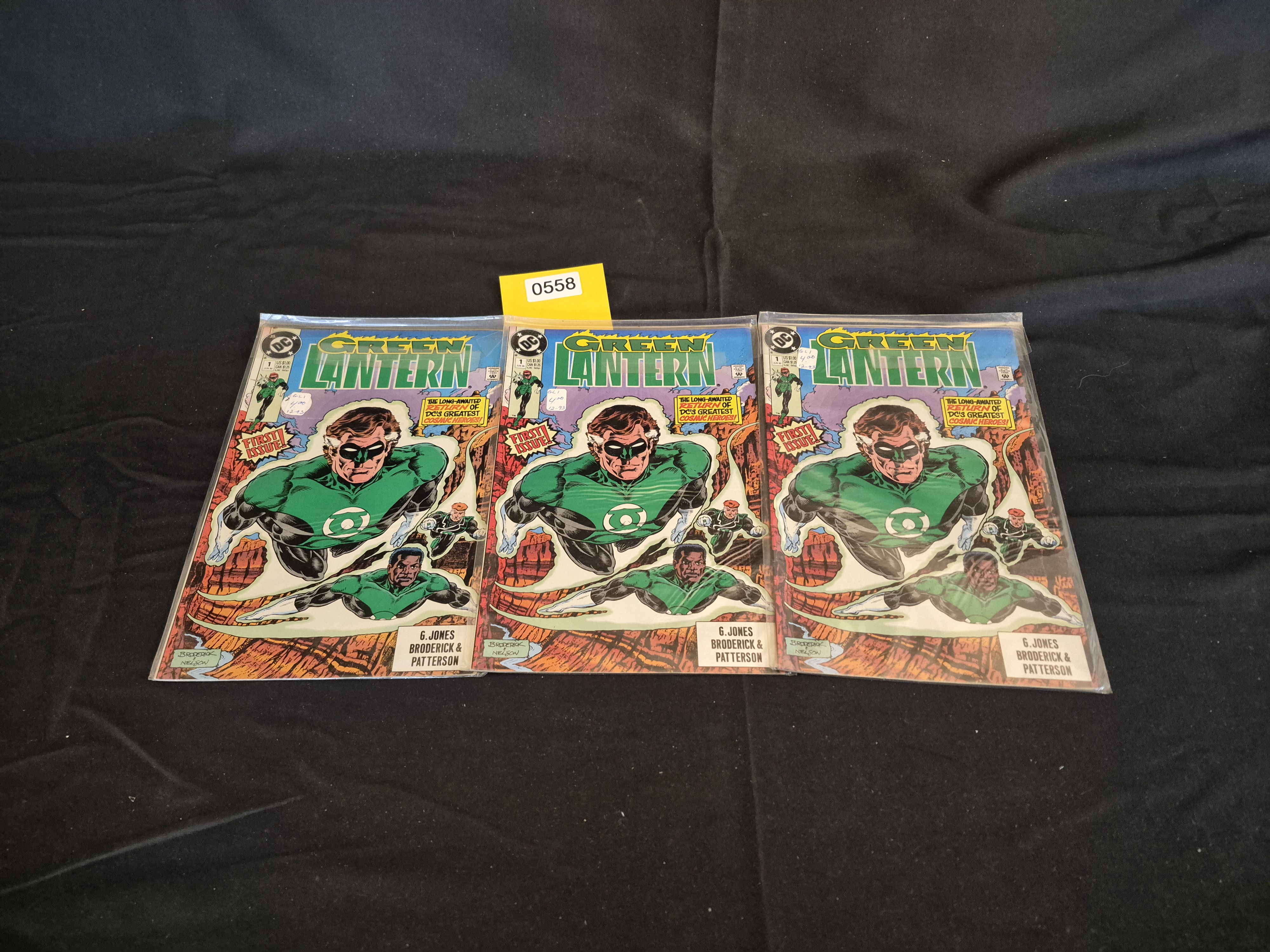 BID PER WHAT YOU SEE IN THE PHOTO, NOT THE AI GENERATED TITLES AND DESCRIPTIONS! A collection of three identical copies of the DC Comics title Green Lantern, Issue #1. The books are identified by the cover text “FIRST ISSUE!” and “THE LONG-AWAITED RETURN OF DC’S GREATEST COSMIC HEROES!” The cover art depicts multiple Green Lantern characters, including Alan Scott and John Stewart, flying over a desert landscape. The cover price is listed as US $1.00. The creative team is credited as G. Jones, Broderick, and Patterson. All three comic books are protected within clear plastic sleeves. Two of the copies feature handwritten notations in the corner box area, reading “GL 1,” “$4.00,” and “12-93,” indicating a likely publication or acquisition date in December 1993. The protective sleeve of the center copy bears a yellow inventory sticker marked “0558.”