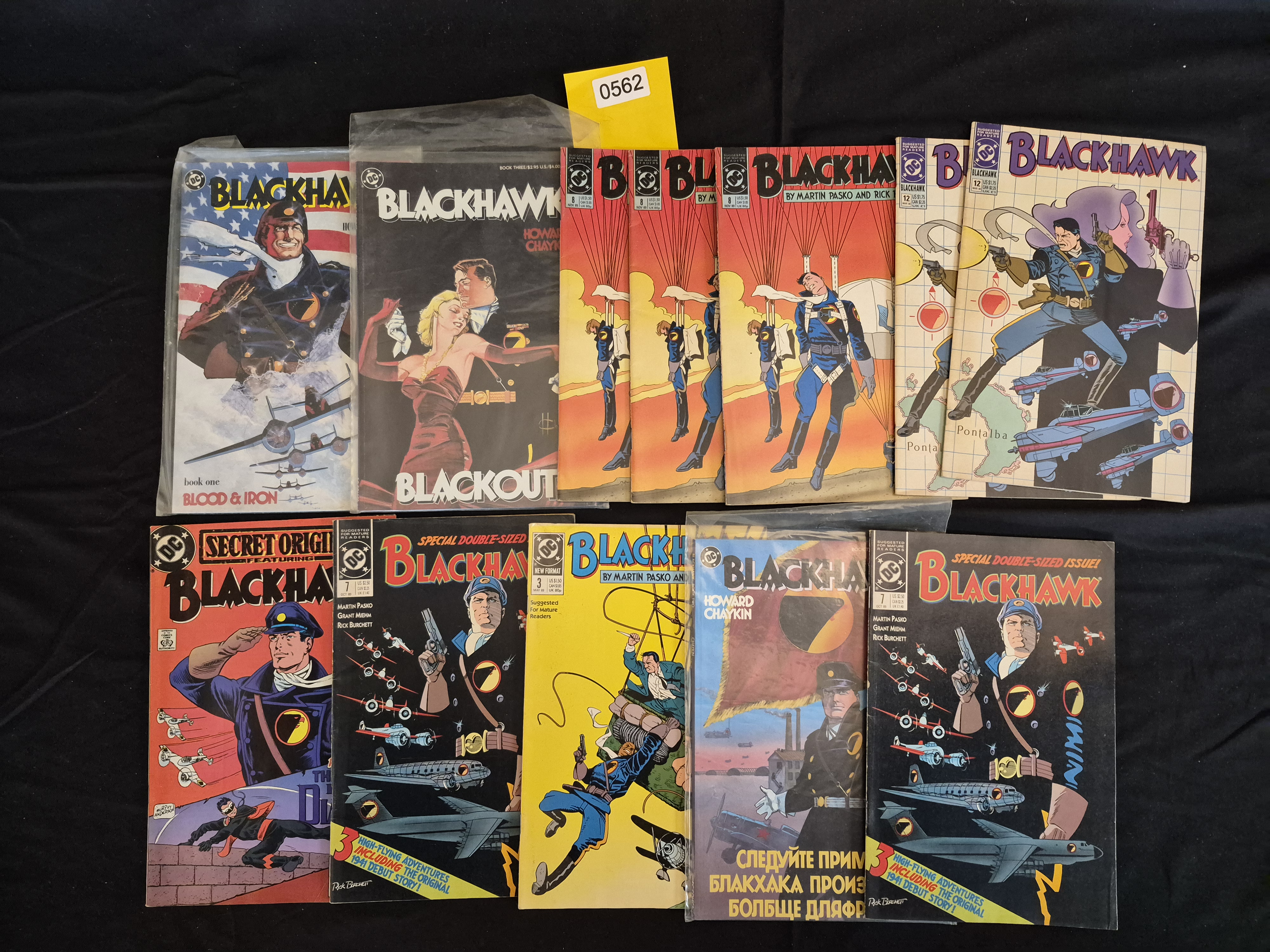 BID PER WHAT YOU SEE IN THE PHOTO, NOT THE AI GENERATED TITLES AND DESCRIPTIONS! A collection of 14 comic books and graphic novels published by DC Comics, focusing on the character Blackhawk and the Blackhawk Squadron. The collection primarily consists of the 1980s/1990s series run, featuring work by creators such as Howard Chaykin and Martin Pasko. The lot includes both single numbered issues and collected editions, such as Book One: Blood & Iron and Book Three: Blackout. Specific numbered issues visible include multiple copies of #7 and #8, often marked Suggested for Mature Readers. The covers feature detailed illustrations related to aviation, espionage, and military themes. One item in the collection features Cyrillic text on the cover, translating to a propaganda message urging action in the style of Blackhawk. Several items are protected in clear poly bags. An inventory sticker labeled 0562 is affixed to one book in the top row.