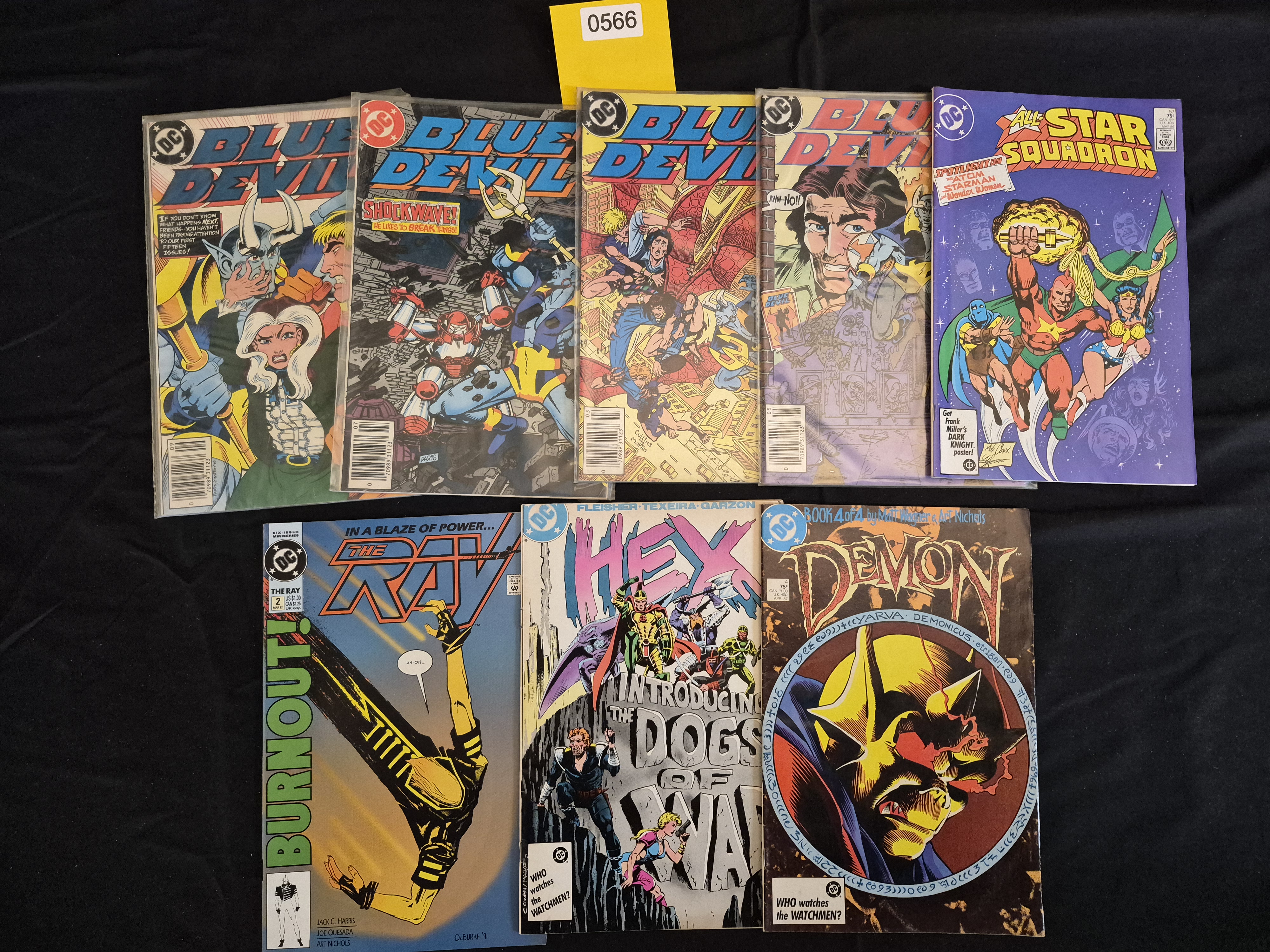 BID PER WHAT YOU SEE IN THE PHOTO, NOT THE AI GENERATED TITLES AND DESCRIPTIONS! A collection of nine standard American comic books published by DC Comics, primarily dating to the Copper Age (mid-1980s through early 1990s). The lot includes five issues of the series Blue Devil, one issue of All-Star Squadron #57, one issue of The Ray #2, one issue of Hex #4, and one issue of Demon #4. The issues Hex #4 and Demon #4 both feature the promotional text WHO watches the WATCHMEN? on the cover, indicating publication during the period following the release of the seminal Watchmen series. All comics are printed paper and appear to be individually sleeved or bagged.