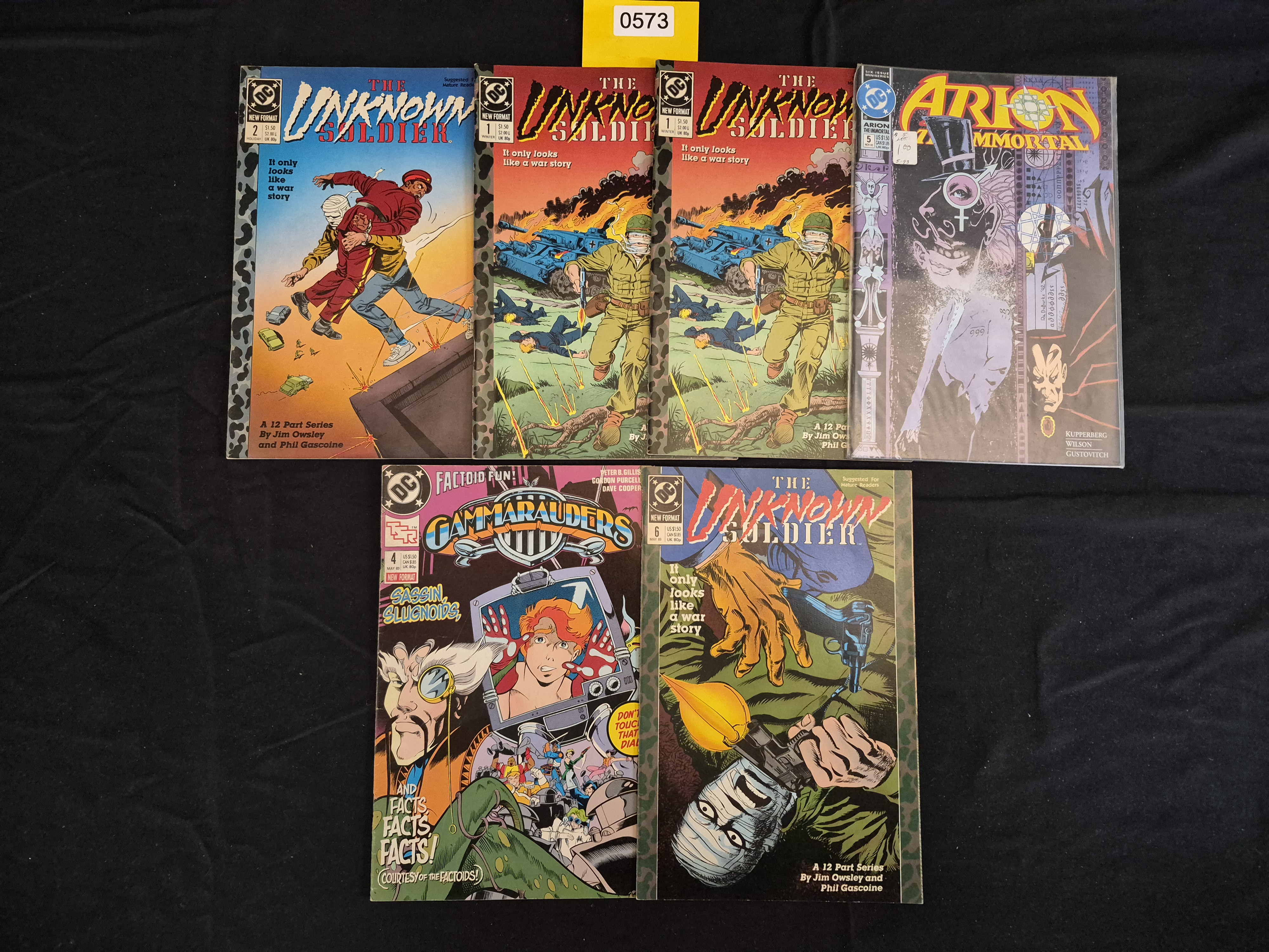 BID PER WHAT YOU SEE IN THE PHOTO, NOT THE AI GENERATED TITLES AND DESCRIPTIONS! A collection of six DC Comics publications from the late 1980s, reflecting the New Format style with US $1.50/$1.85 cover prices. The lot includes four issues of The Unknown Soldier (issues #1 (two copies), #2, and #6), one issue of Gammarauders (#4, confirmed by web research as May 1989), and one issue of Arion The Immortal (#5, noted as part of a Six Issue Miniseries). The covers are glossy printed paper stock. Several issues of The Unknown Soldier are identified on the cover as being part of a 12 Part Series.