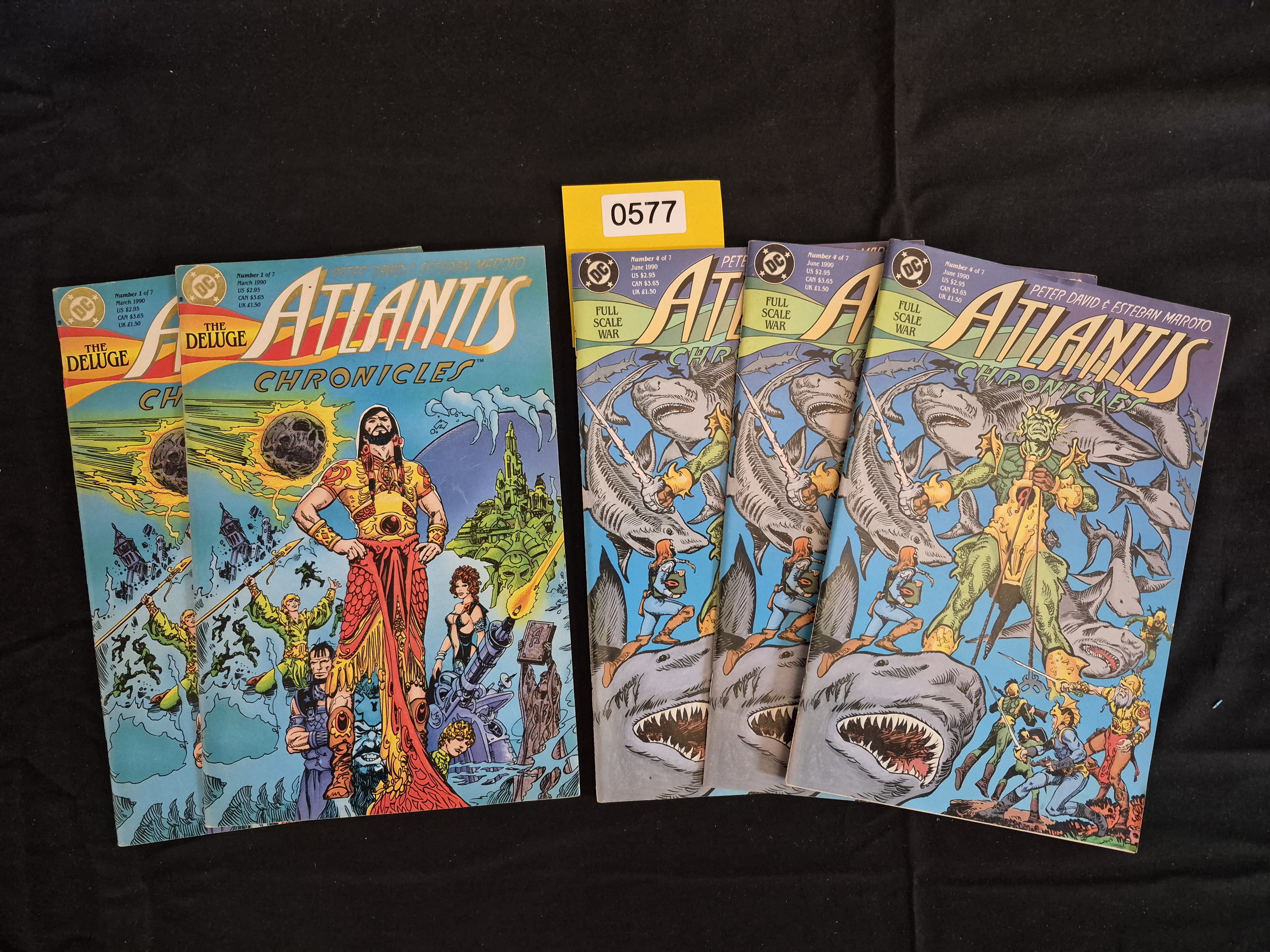 BID PER WHAT YOU SEE IN THE PHOTO, NOT THE AI GENERATED TITLES AND DESCRIPTIONS! A collection of six American comic books from the DC Comics limited series Atlantis Chronicles, published in 1990. The lot consists of three copies of Issue Number 1, titled The Deluge (March 1990), and three copies of Issue Number 4, titled Full Scale War (June 1990). The seven-issue series was written by Peter David and illustrated by Esteban Maroto. Each comic features a full-color cover illustration depicting mythological scenes and is marked with a US cover price of $2.95, a Canadian price of $3.65, and a UK price of £1.50. The issues are presented raw and are identified by the auction tag 0577.