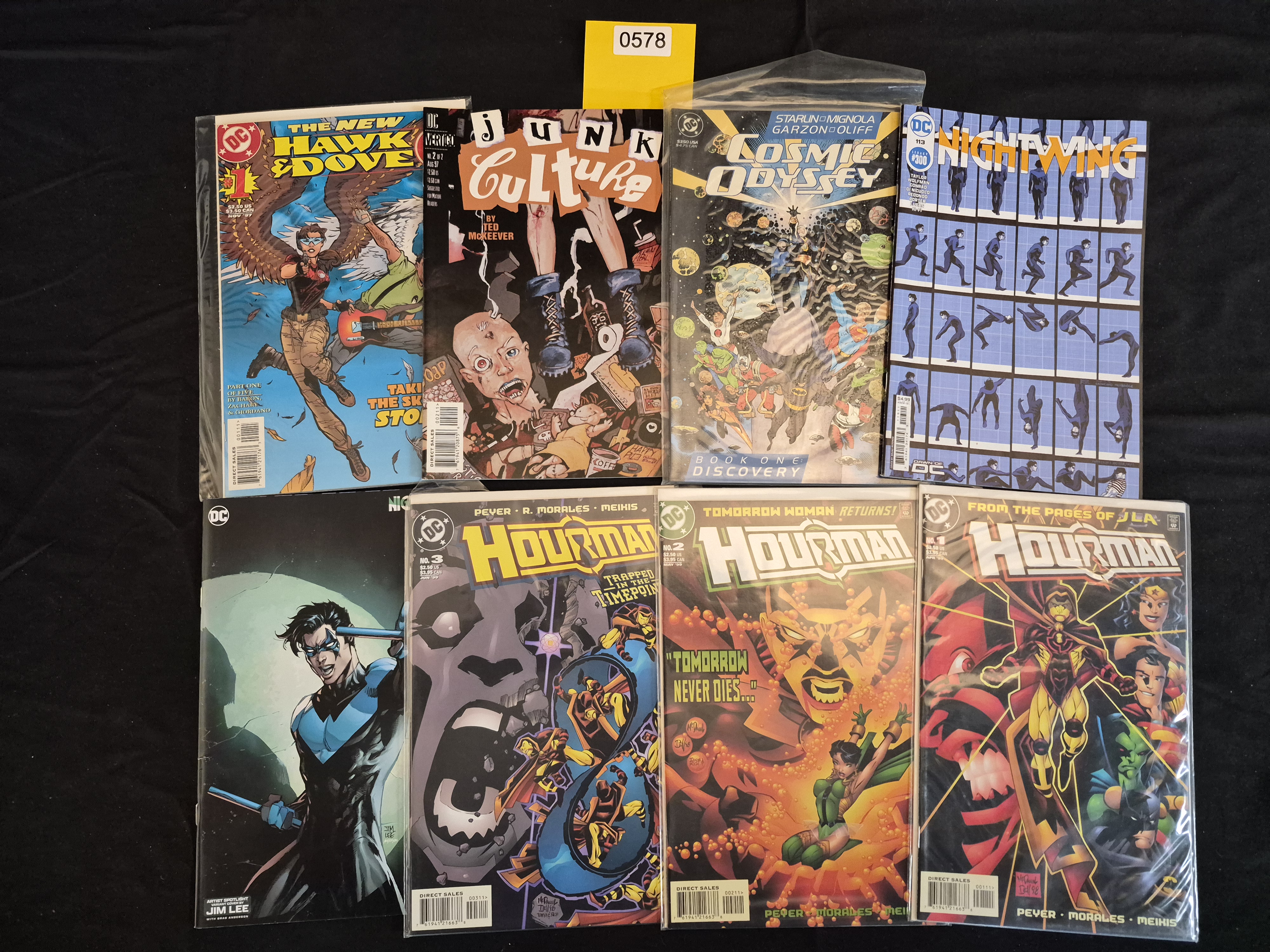 BID PER WHAT YOU SEE IN THE PHOTO, NOT THE AI GENERATED TITLES AND DESCRIPTIONS! A collection of eight Modern Age comic books published by DC Comics and its Vertigo imprint, dating primarily from the late 1990s through the early 2000s. The lot includes four issues of Hourman (Nos. 1, 2, and 3, dated 1999, with one issue #1 appearing to be a variant or second printing based on cover art), two issues of Nightwing (one being Issue #113/Legacy #300, featuring a Jim Lee cover, and a second Nightwing issue also featuring a Jim Lee cover), one copy of the DC title The New Hawk & Dove (No. 1, November 1997), one DC Vertigo title titled Junk Culture (No. 2, August 1997), and one issue of Cosmic Odyssey (Book One: Discovery). All comics feature full-color glossy covers and are stored in protective plastic sleeves or bags.