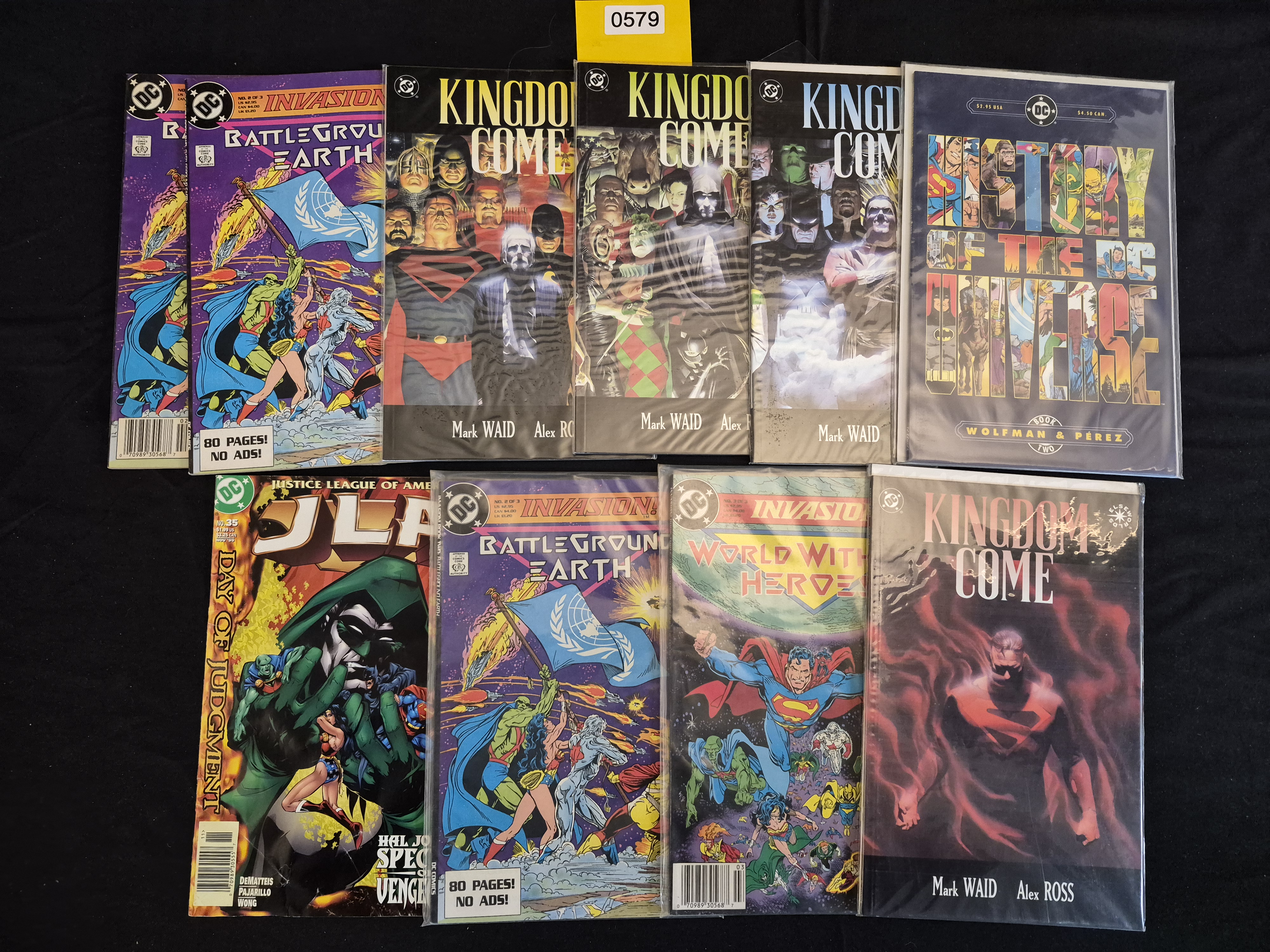 BID PER WHAT YOU SEE IN THE PHOTO, NOT THE AI GENERATED TITLES AND DESCRIPTIONS! A collection of ten (10) Modern Age DC Comics publications, primarily prestige format and standard comic books, secured in protective plastic sleeves. The lot is centered around the critically acclaimed Kingdom Come series (Mark Waid and Alex Ross), represented by four issues with varying cover art, including one issue bearing the Elseworlds logo. Also included are three issues from the Invasion! crossover series, specifically two copies of No. 2 of 3 (marked 80 PAGES! NO ADS!) and one copy of No. 3 of 3. The collection is rounded out by one copy of JLA: Day of Judgment No. 35 and one copy of History of the DC Universe, Book Two (Wolfman & Pérez). All issues feature full-color printing, DC Comics logos, printed barcodes, and standard US price information ($2.95-$3.99 USA).