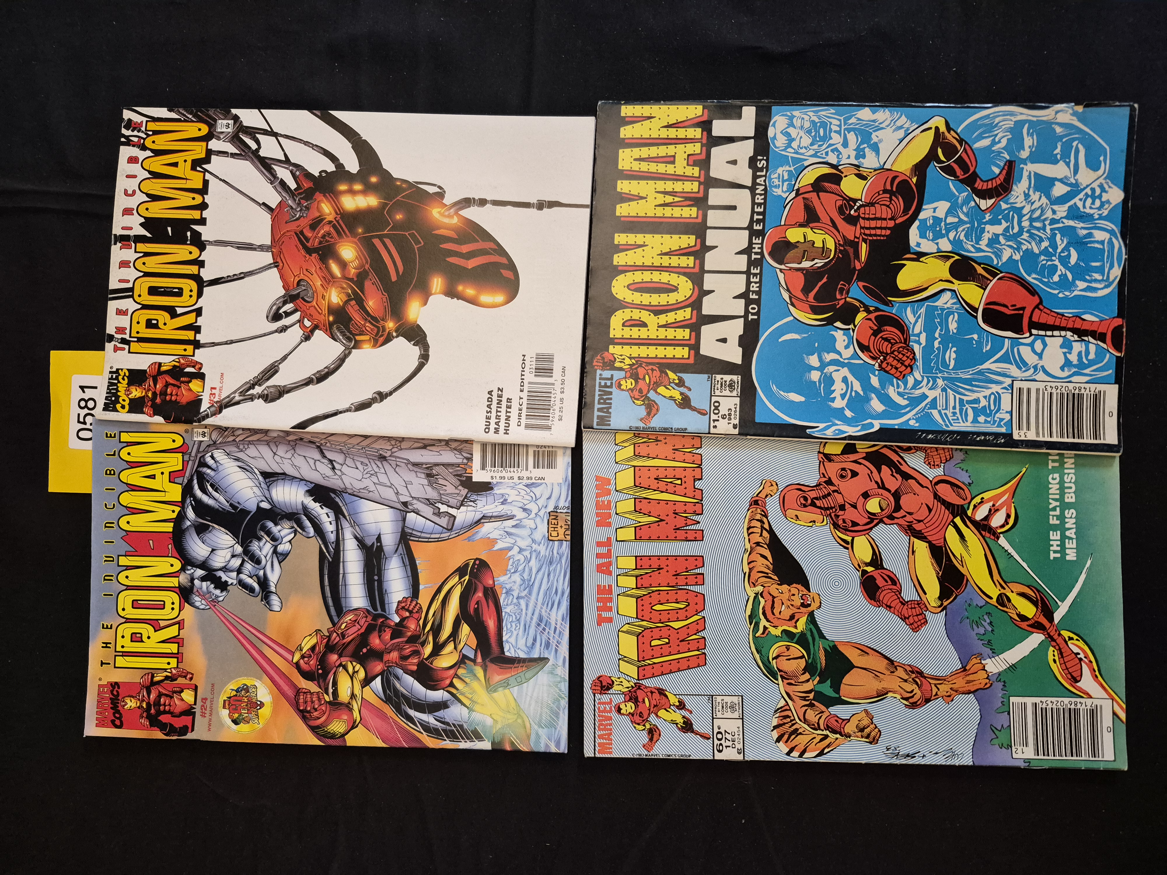 BID PER WHAT YOU SEE IN THE PHOTO, NOT THE AI GENERATED TITLES AND DESCRIPTIONS! A collection of 4 saddle-stitched comic books published by Marvel Comics, featuring the character Iron Man across two distinct publication eras. The lot includes two issues from the Bronze Age (1983) and two modern issues. The Bronze Age comics are The All-New Iron Man #177 (60 cent variant, featuring the Flying Tiger) and Iron Man Annual #6 (1.00 variant, subtitled “TO FREE THE ETERNALS!”). The modern issues are The Invincible Iron Man #24 ($1.99 cover price) and The Invincible Iron Man #31 Direct Edition ($2.25 cover price), displaying a contemporary digital art style. All items are constructed of printed paper and feature full-color covers. An administrative tag marked “0581” is partially visible at the top center.