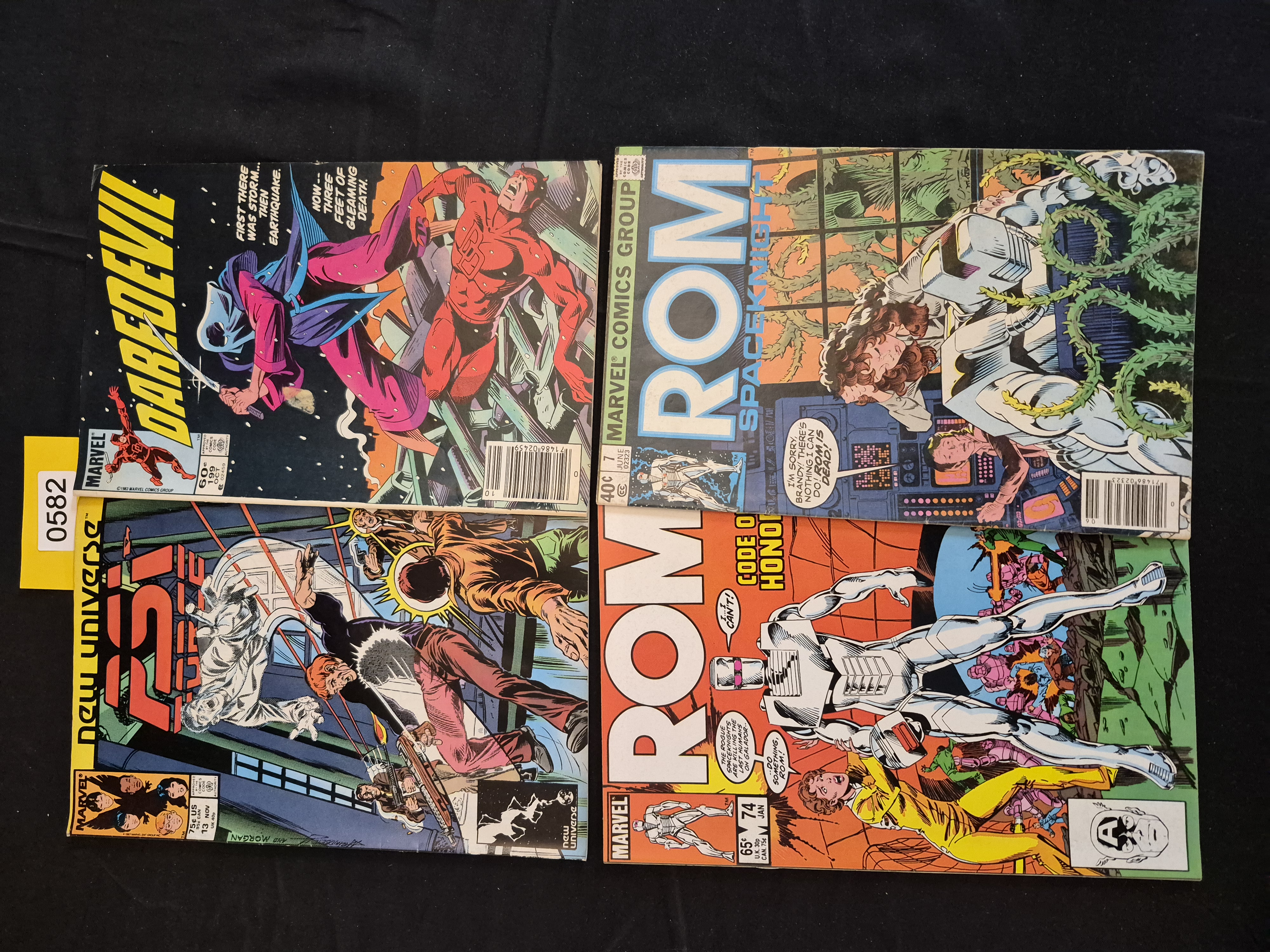 BID PER WHAT YOU SEE IN THE PHOTO, NOT THE AI GENERATED TITLES AND DESCRIPTIONS! A collection of four vintage American comic books published by Marvel Comics, dating primarily to the Copper Age (1980s). The lot includes two issues related to the Rom Spaceknight title (*Rom* #74, 65¢ and *Rom Spaceknight* #7, 40¢), alongside *Daredevil* #199 (60¢) and the Marvel New Universe title *Psi-Force* #13 (75¢). These are standard saddle-stitched periodicals featuring full-color illustrated covers, standard paper stock, and visible UPC barcodes. The issues display the Approved Comics Code Authority seal.