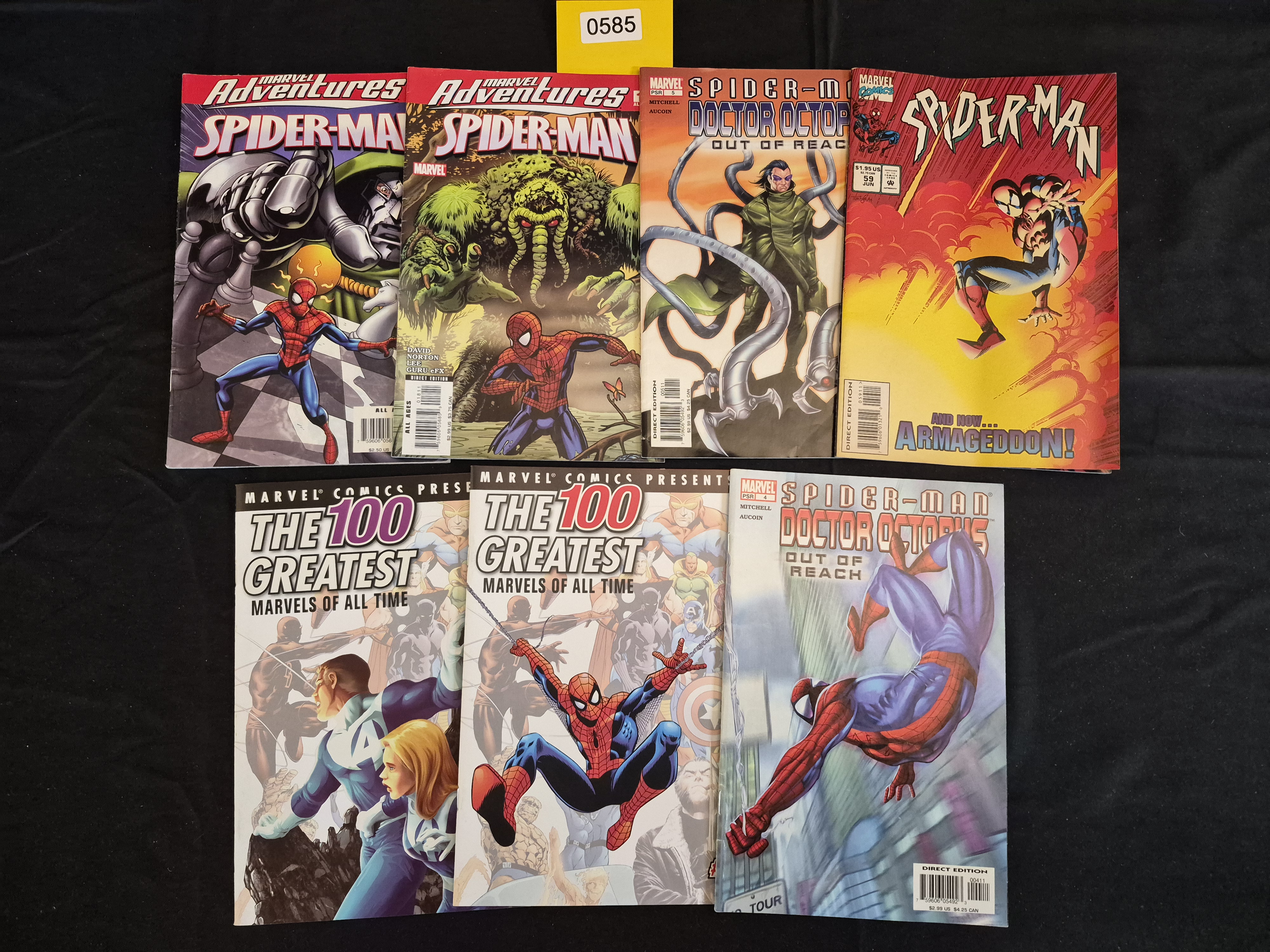 BID PER WHAT YOU SEE IN THE PHOTO, NOT THE AI GENERATED TITLES AND DESCRIPTIONS! A collection of seven Modern Age Marvel comic books, primarily centered on the character Spider-Man, published by Marvel Comics. The collection includes titles such as Marvel Adventures Spider-Man (Issues #11 and #18), Spider-Man: Armageddon! (#99), and two related issues of the limited series Spider-Man Doctor Octopus Out of Reach (Issues #4 and #5). The lot also contains two parts (Part 3 and Part 4) of the Marvel Comics Present The 100 Greatest Marvels of All Time series, which features Spider-Man alongside other prominent Marvel heroes, including the Fantastic Four. Many of the issues are identified as Direct Editions. The material consists of standard glossy paper stock typical of modern periodicals.