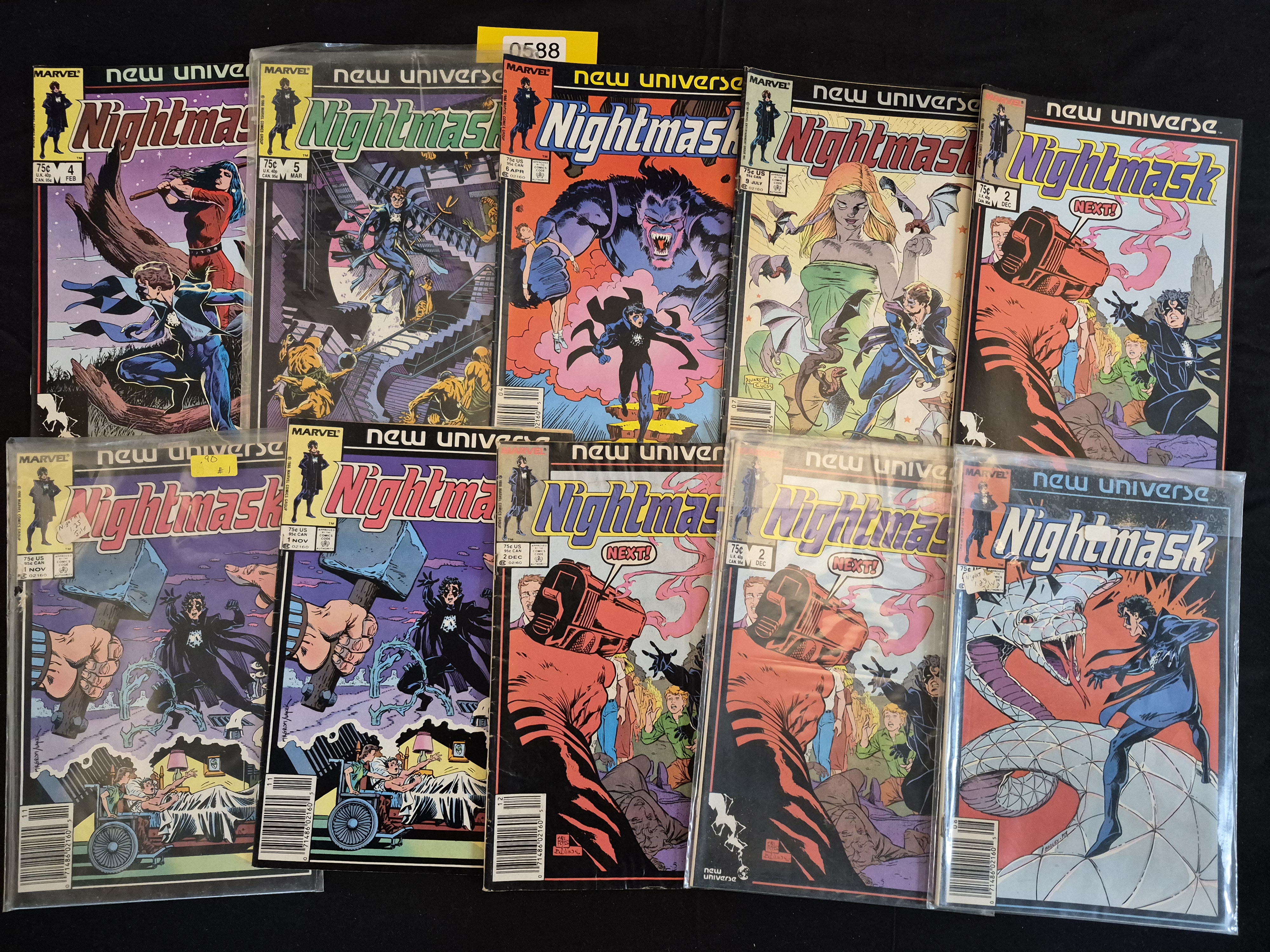 BID PER WHAT YOU SEE IN THE PHOTO, NOT THE AI GENERATED TITLES AND DESCRIPTIONS! A collection of 11 standard format comic books published by Marvel Comics under the New Universe imprint. The collection features the series Nightmask, published across 1986 and 1987. The lot includes issues #1 (Nov), #2 (Dec, three copies), #3 (Jan), #4 (Feb), #5 (Mar), #6 (Apr), #7 (May), #9 (July), and #12 (Nov). Each comic displays the original cover price of 75¢ US.