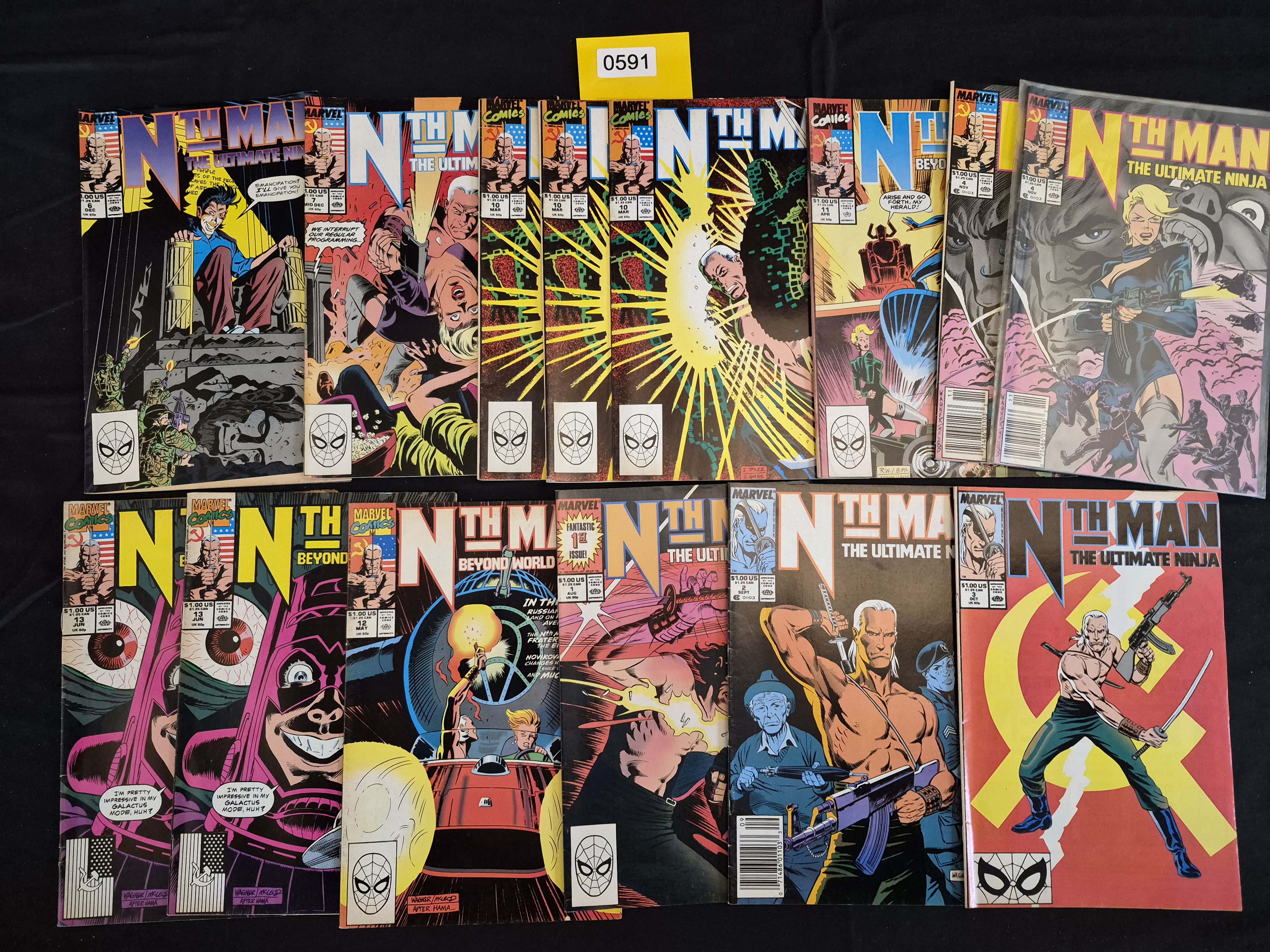 BID PER WHAT YOU SEE IN THE PHOTO, NOT THE AI GENERATED TITLES AND DESCRIPTIONS! A collection of seventeen individual comic books from the Marvel Comics series Nth Man, published in the late 1980s and early 1990s. The series is primarily subtitled The Ultimate Ninja, with later issues also carrying the subtitle Beyond World. The lot includes various issues ranging from number 1 through 14, including visible duplicates. Construction consists of printed paper with full-color covers, characteristic of the period. Visible cover details include the Marvel Comics logo, the “Approved by the Comics Code Authority” stamp, and a typical cover price of $1.00 US. Cover artwork consistently features action and martial arts themes, including motifs such as the Soviet Hammer and Sickle symbol on several issues, reflecting the Cold War era setting of the series. One issue is visibly advertised as a “Fantastic 1st Issue!”.