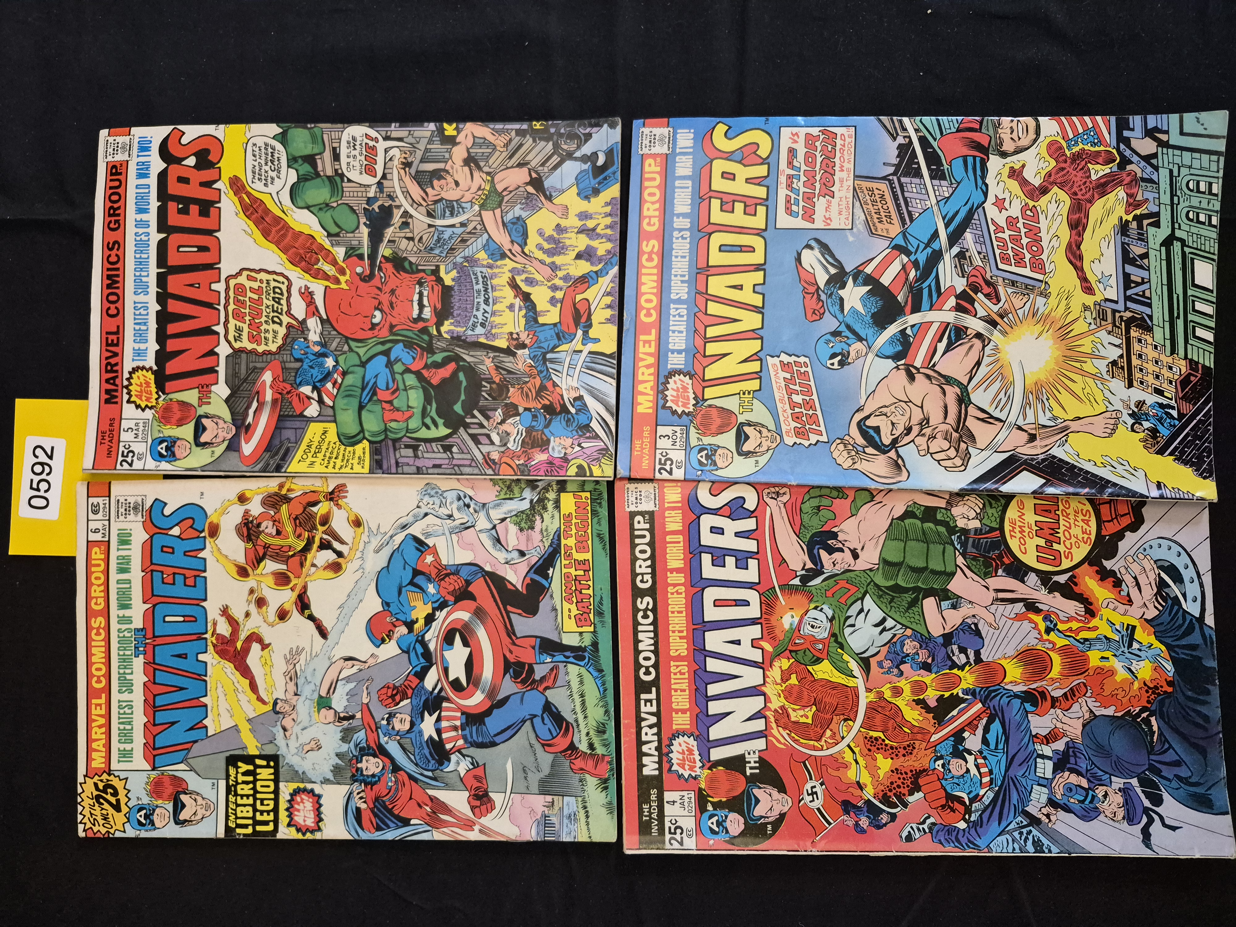 BID PER WHAT YOU SEE IN THE PHOTO, NOT THE AI GENERATED TITLES AND DESCRIPTIONS! A collection of four vintage Bronze Age comic books from the Marvel Comics Group series, The Invaders, subtitled “The Greatest Superheroes of World War Two!”. This series is identified by web intelligence as originating in the mid-1970s (Vol. 1, 1975-1977 run). The collection includes issues number 3 (November), 4 (January), 5 (March), and 6 (May). Each issue displays the original cover price of 25¢. The covers feature classic Marvel characters such as Captain America, Sub-Mariner, and the Human Torch engaging antagonists including the Red Skull and U-Man. The comic books are constructed of glossy paper covers and interior newsprint pages.