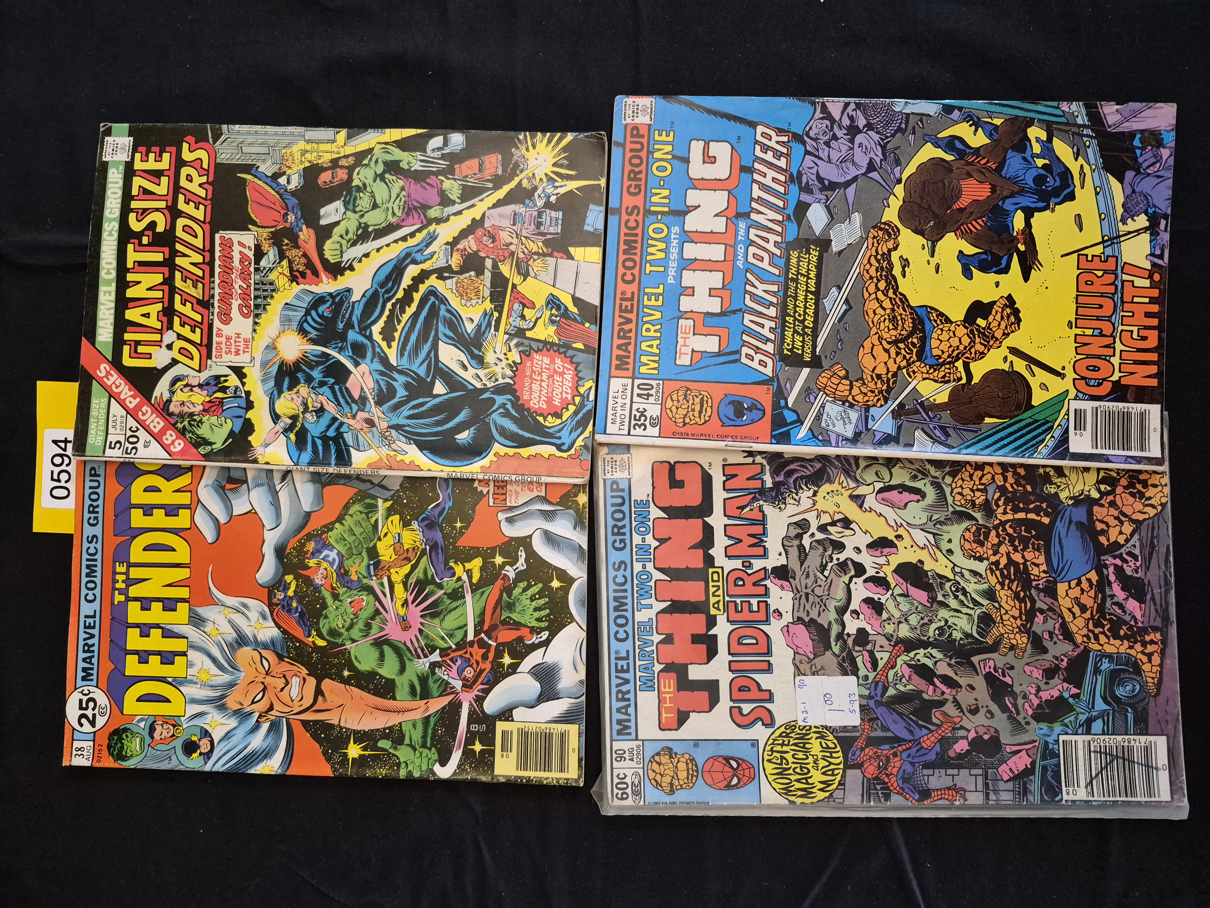BID PER WHAT YOU SEE IN THE PHOTO, NOT THE AI GENERATED TITLES AND DESCRIPTIONS! A collection of four vintage American comic books published by Marvel Comics Group, dating from the Bronze/Copper Age period. The lot includes issues from two key series featuring The Thing and the Defenders. The issues present are The Defenders #38 (25 cent cover price) and Giant-Size Defenders #5 (50 cent cover price, noted as 68 Big Pages). The lot also includes two issues of Marvel Two-In-One featuring The Thing: Issue #90 (60 cent cover price) co-starring Spider-Man, and Issue #40 (35 cent cover price) co-starring the Black Panther. All issues are standard printed paper booklets featuring vibrant, illustrated covers and bear the Comics Code Authority stamp.