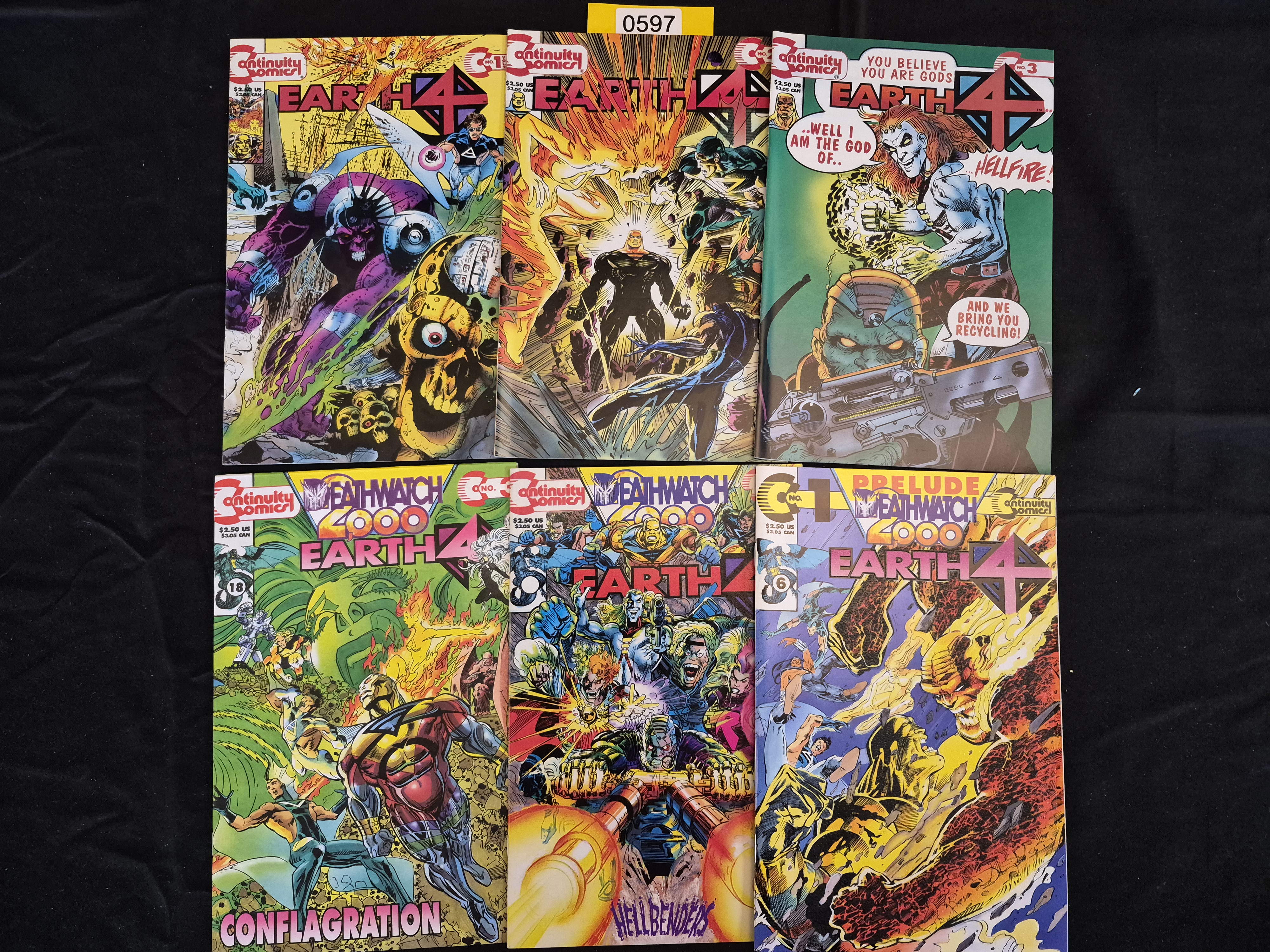 BID PER WHAT YOU SEE IN THE PHOTO, NOT THE AI GENERATED TITLES AND DESCRIPTIONS! A collection of six American superhero comic books published by Continuity Comics, featuring titles related to the Earth 4 and Deathwatch 2000 storylines, published in the 1990s. This lot includes the three main issues of the Earth 4 series (issues 1, 2, and 3), alongside three related issues from the Deathwatch 2000 Earth 4 run: Prelude No. 1, No. 3 (“Hellbenders”), and No. 18 (“Conflagration”). The publications feature vibrant, heavily stylized cover artwork characteristic of 1990s independent comic publications. Each book displays a consistent cover price of $2.50 US printed on the cover.