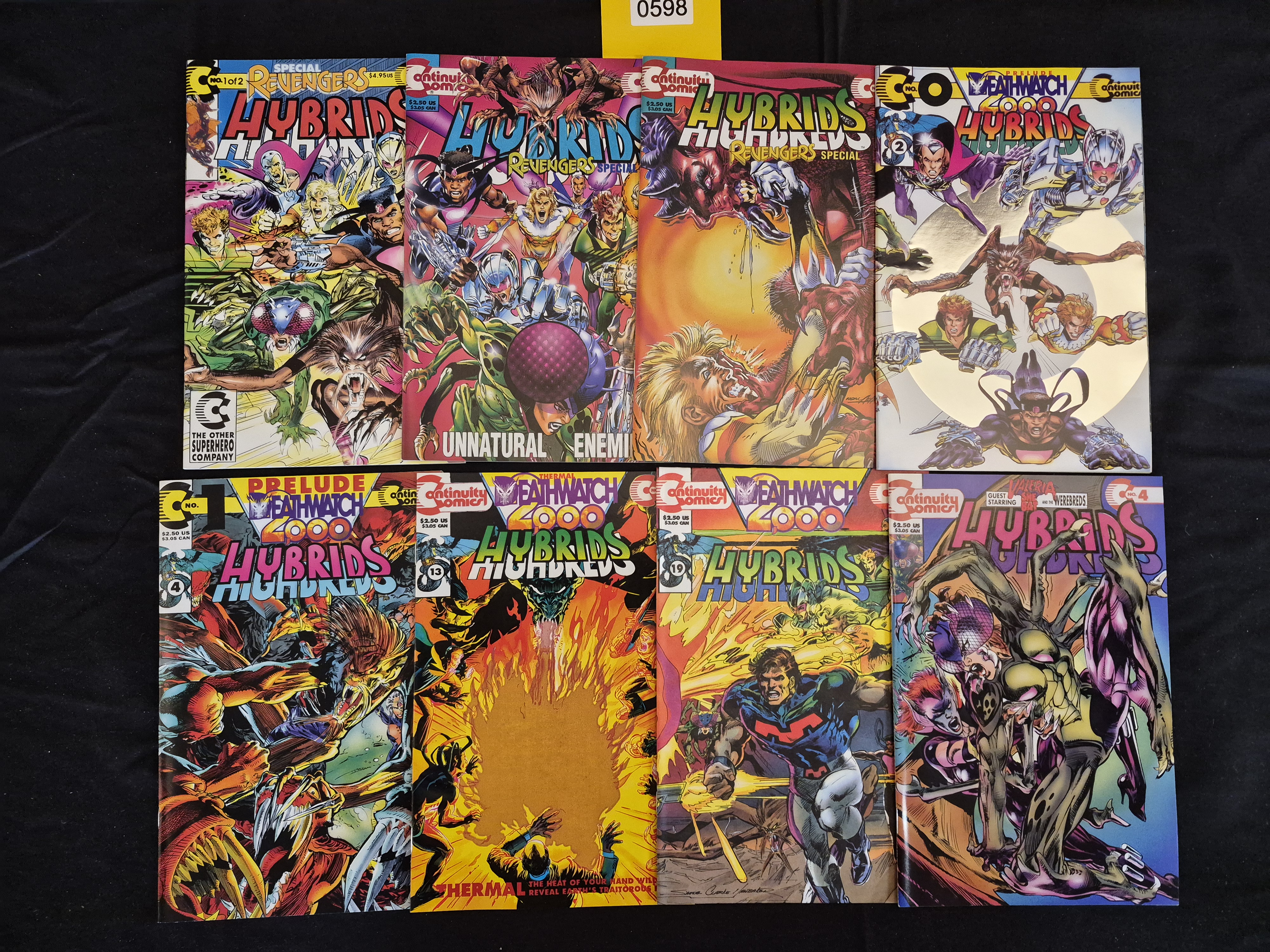 BID PER WHAT YOU SEE IN THE PHOTO, NOT THE AI GENERATED TITLES AND DESCRIPTIONS! A collection of 8 modern comic books published by Continuity Comics in the 1990s, primarily featuring the Hybrids and Deathwatch 2000 Hybrids titles. The series is frequently associated with creator Neal Adams. Specific identified issues include Hybrids Revengers Special No. 1 of 2, and Deathwatch 2000 Hybrids Nos. 2, 4, 13, and 19. Two issues feature specialty cover treatments typical of the era: one issue utilizes a metallic or foil cover (Row 1, Item 4), and another features a thermal-sensitive cover element (Row 2, Item 2) which includes the text, THE HEAT OF YOUR HAND REVEAL EARTH’S TRAITOR.