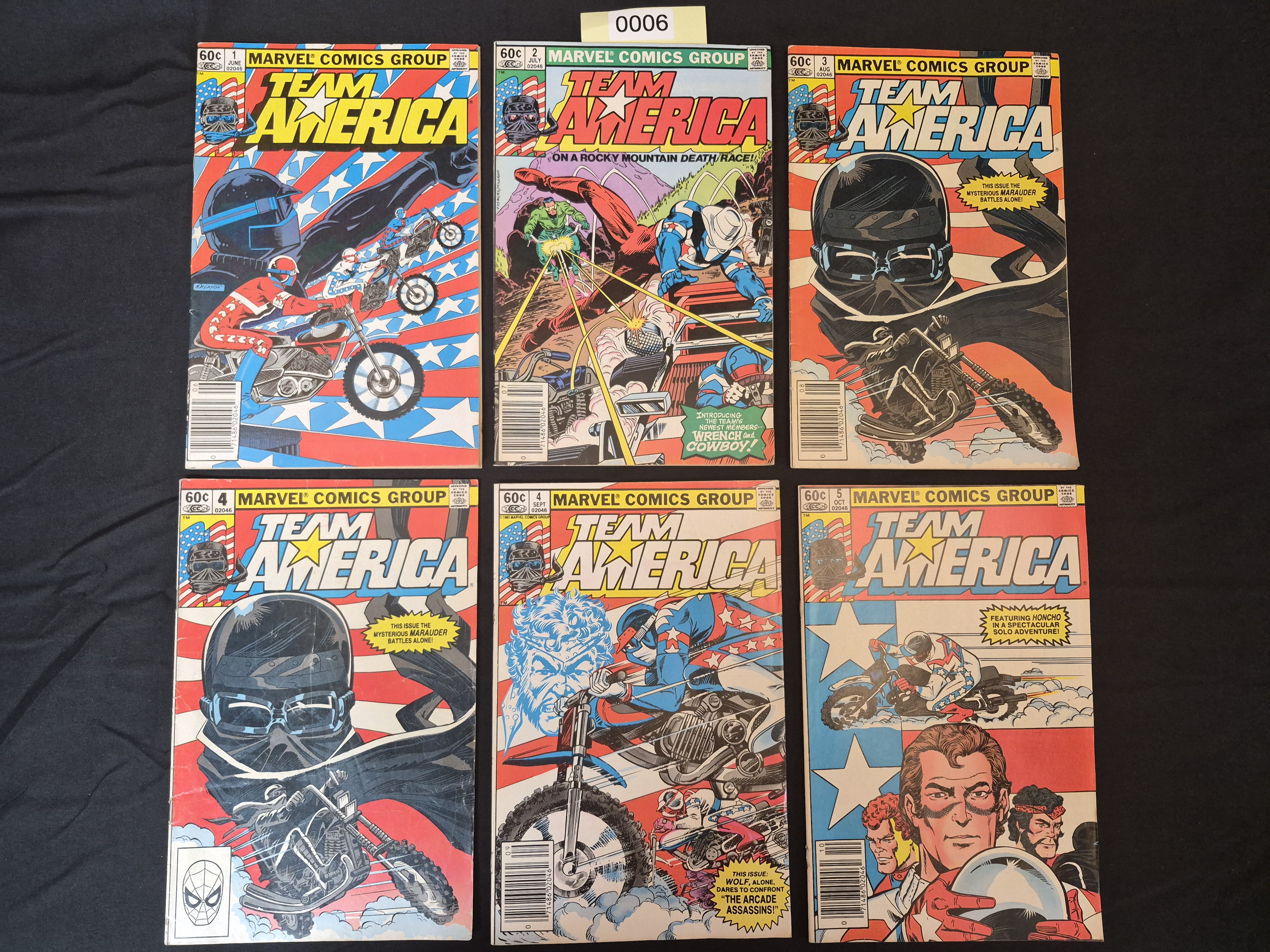 BID PER WHAT YOU SEE IN THE PHOTO, NOT THE AI GENERATED TITLES AND DESCRIPTIONS! The collection consists of six standard-size comic books from the Marvel Comics Group series Team America, published in 1982 during the Bronze Age era. The lot includes issues numbered 1 (June), 2 (July), 3 (August), two copies of issue 4 (September), and issue 5 (October). All issues feature a 60¢ cover price and the Comics Code Authority seal. The covers prominently feature action-oriented illustrations of characters riding dirt bikes or motorcycles, often utilizing American stars and stripes motifs. Web intelligence indicates that issue #3 is notable for the first appearance or solo story of the Marauder. All copies appear to be newsstand editions, evidenced by the visible UPC barcodes. The material is standard printed paper.