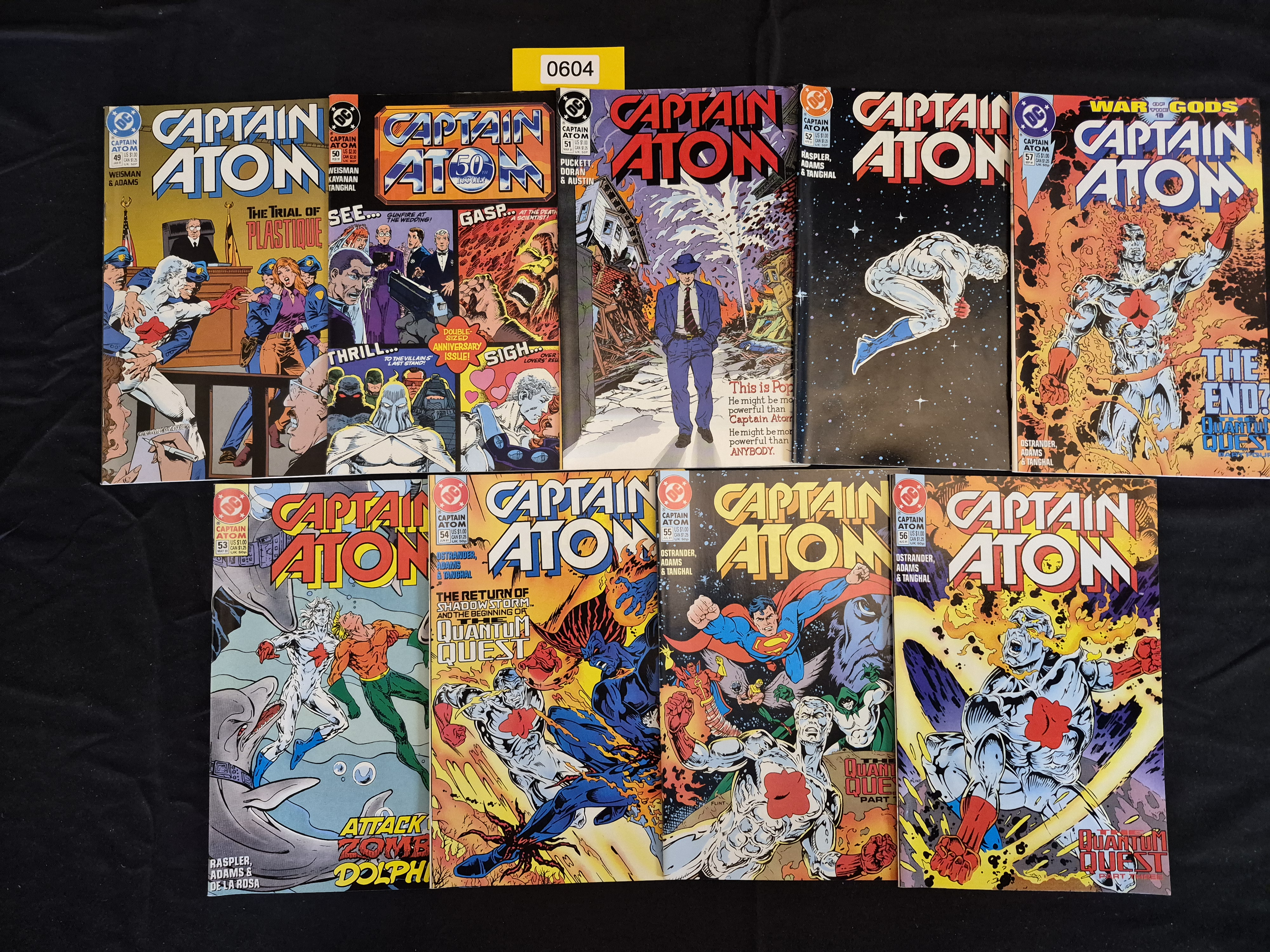 BID PER WHAT YOU SEE IN THE PHOTO, NOT THE AI GENERATED TITLES AND DESCRIPTIONS! A collection of 12 comic book periodicals published by DC Comics under the title Captain Atom (1986-1991 series). The issues visible date primarily to the 1991 publication year and represent the late Copper/Early Modern Age of comics. Specific issues in the collection include the double-sized #50 Anniversary Issue, #49 (The Trial of Plastique), and #57, which is identified as a part of the “War of the Gods” crossover event. The collection also features multiple sequential parts of the multi-issue “The Quantum Quest” storyline, including visible appearances by major DC characters such as Superman and The Spectre. The collection also includes a cover featuring the “Attack Zomb Dolph” storyline. The comics feature standard paper stock and vibrant color printing typical of the era.