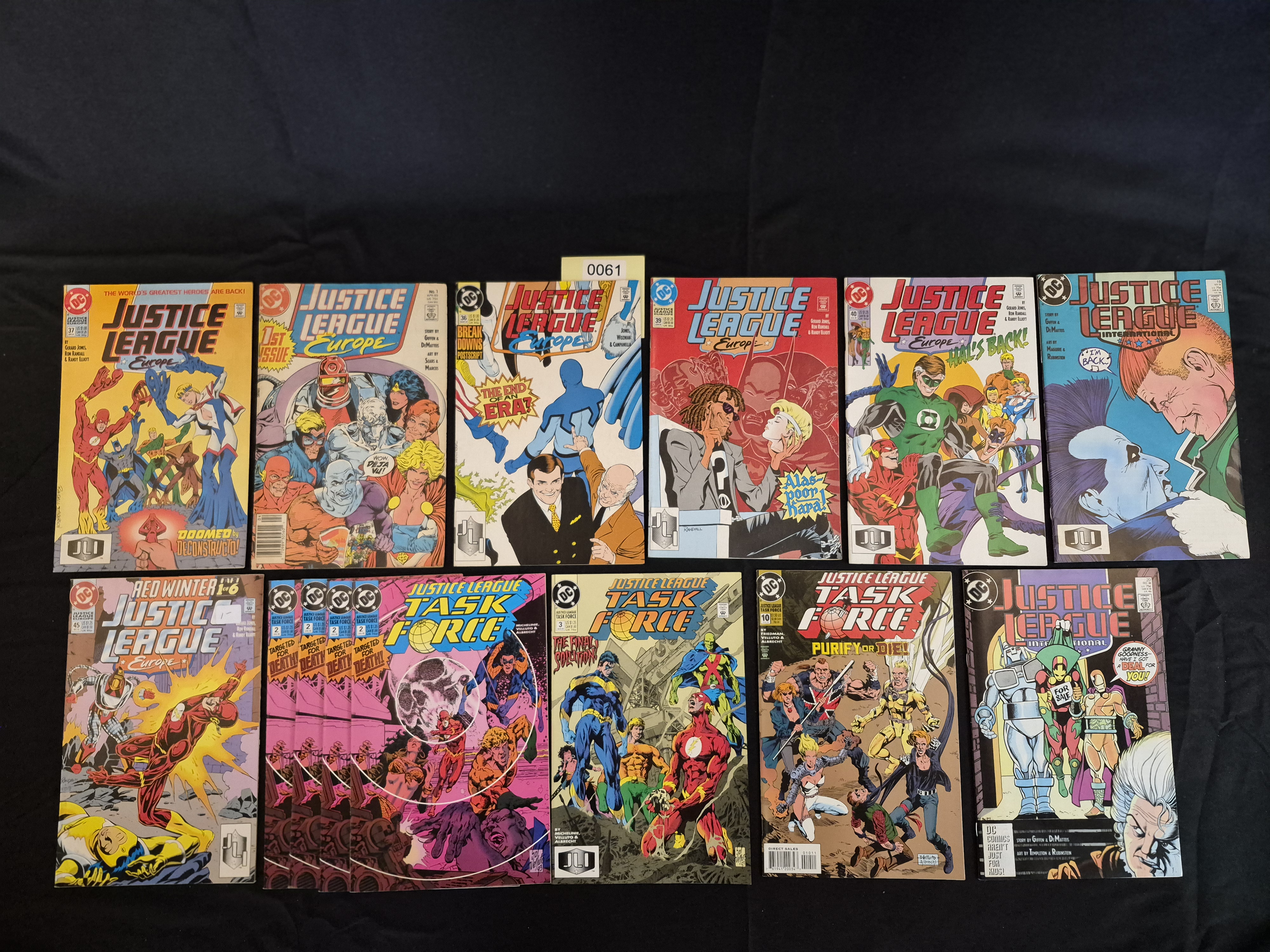BID PER WHAT YOU SEE IN THE PHOTO, NOT THE AI GENERATED TITLES AND DESCRIPTIONS! A collection of 14 DC Comics comic books published primarily in the late 1980s and early 1990s, focusing on the Justice League franchise spin-off titles. The lot includes various issues of Justice League Europe, Justice League Task Force, and Justice League International. Visible issue numbers range from #1 to the mid-40s, including storyline identifiers such as Red Winter 1 of 6 and The Final Solution. The comics are printed on standard paper stock typical of the era.