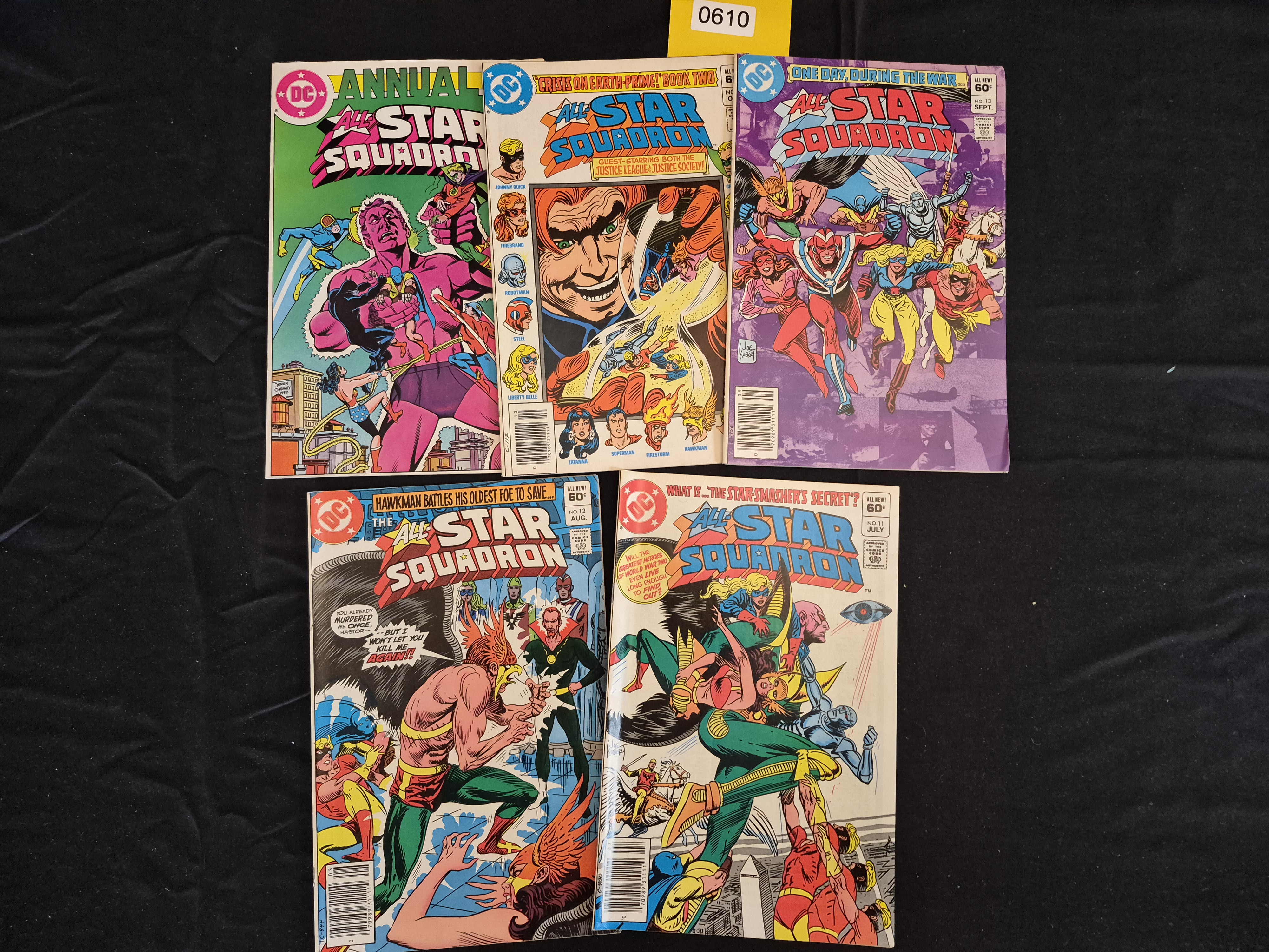 BID PER WHAT YOU SEE IN THE PHOTO, NOT THE AI GENERATED TITLES AND DESCRIPTIONS! This lot consists of a collection of five vintage DC Comics periodicals from the All-Star Squadron series, generally dating to the Bronze/Early Modern Age (1981-1987). The collection includes one Annual issue and four standard numbered issues. Visible numbered issues include No. 11 (July), No. 12 (August), and No. 13 (September). All issues feature the DC circular logo, the Comics Code Authority seal, and a cover price of 60¢. Key visible cover text includes “Crisis on Earth-Prime! Book Two,” “Hawkman Battles His Oldest Foe,” and “What Is…The Star-Smasher’s Secret?”. The covers depict various Justice Society and Justice League characters, including Hawkman, Firestorm, and Liberty Belle.