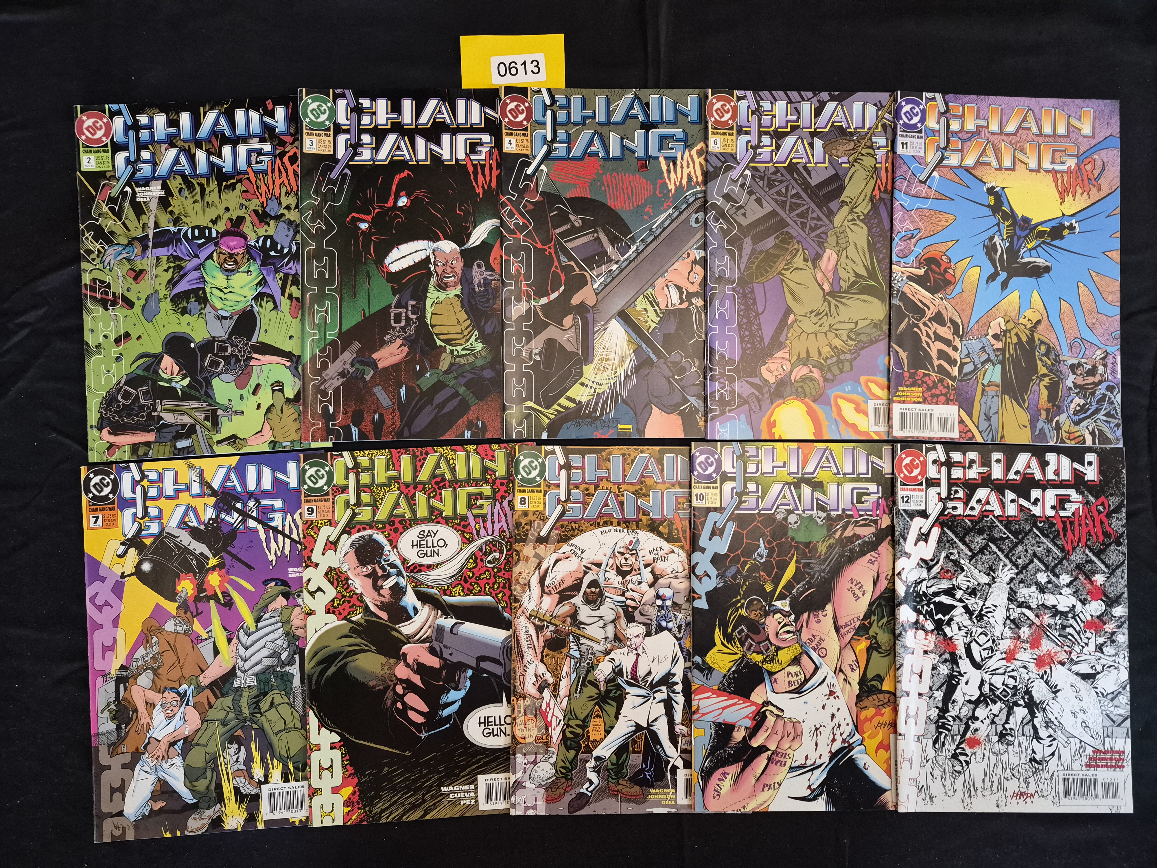 BID PER WHAT YOU SEE IN THE PHOTO, NOT THE AI GENERATED TITLES AND DESCRIPTIONS! A collection of 11 modern American comic books constituting a partial run of the DC Comics miniseries Chain Gang War, published primarily in 1993 and 1994. The lot includes issues #2, #3, #4, #5, #6, #7, #8, #9, #10, #11, and #12, representing 11 of the 12 issues in the complete series. The comics are standard paper format featuring dramatic, action-oriented cover art typical of the late 20th-century style, utilizing bold colors, aggressive compositions, and depictions of armed conflict. The series title CHAIN GANG WAR and issue numbers are clearly visible on the covers, along with the DC Comics logo. The visible cover price of $1.75 US is consistent with the early 1990s publication period.