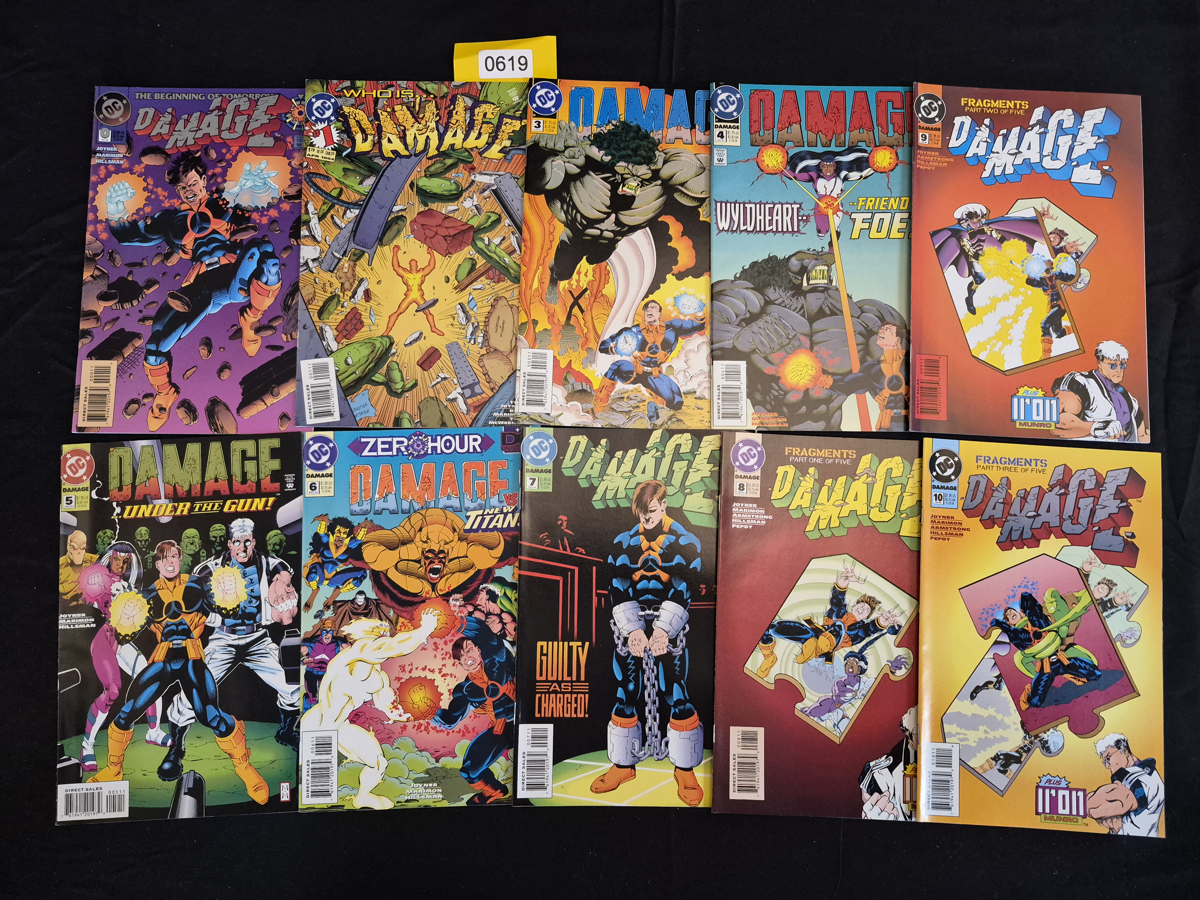 BID PER WHAT YOU SEE IN THE PHOTO, NOT THE AI GENERATED TITLES AND DESCRIPTIONS! A collection of 10 sequential comic books from the DC Comics series Damage, published in the mid-1990s. The lot includes Issues 1 through 10. These standard paper periodicals feature the DC logo and “DIRECT SALES” UPC barcodes, consistent with collector-market distribution of the era. Specific issues include the crossover event “ZERO HOUR” (Issue 6) and the multi-part story arc “FRAGMENTS” (Issues 8, 9, and 10). Issue 9 also features the character Iron Munro. A yellow inventory sticker marked “0619” is visible on the upper edge of Issue 3.