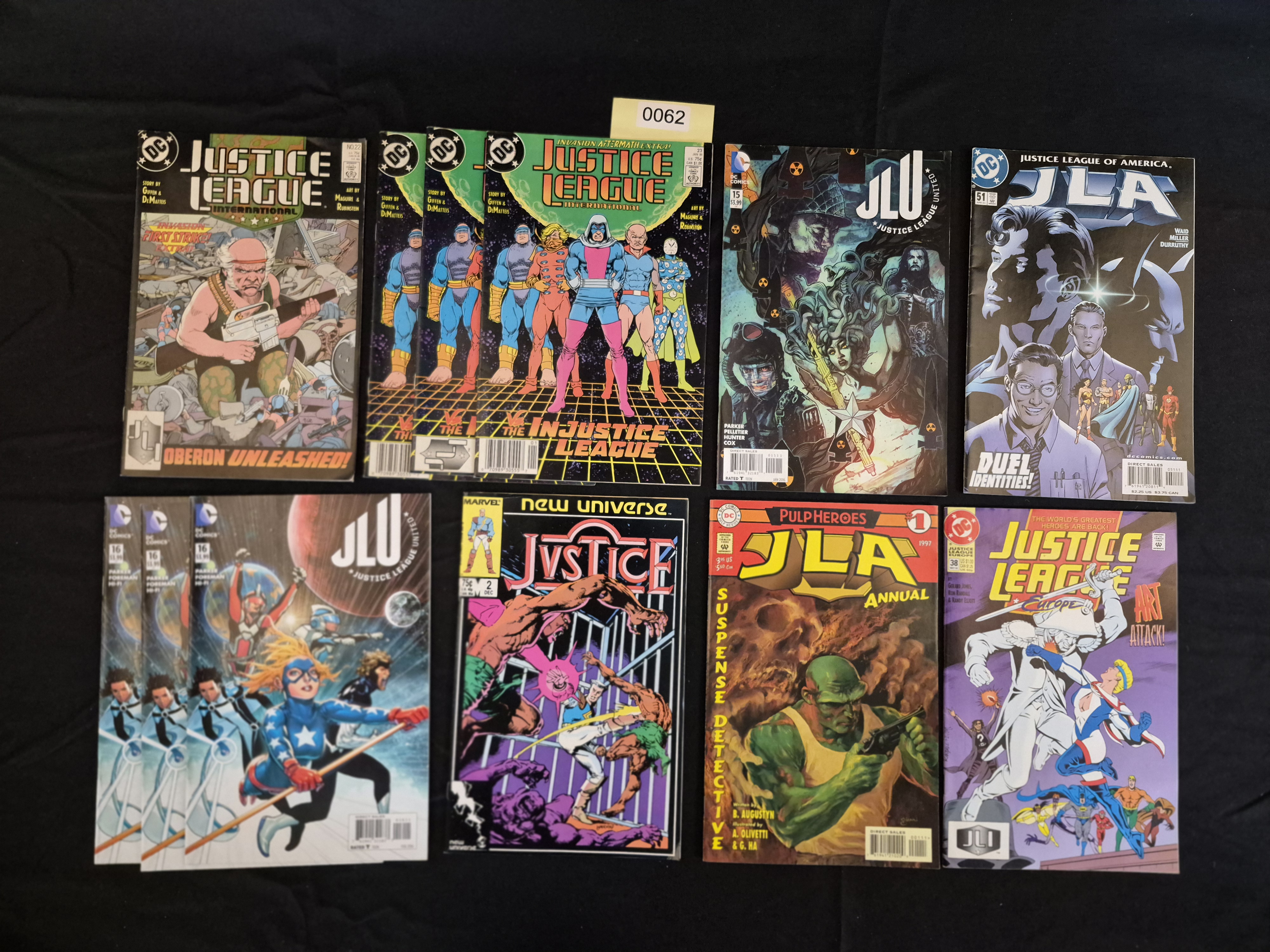 BID PER WHAT YOU SEE IN THE PHOTO, NOT THE AI GENERATED TITLES AND DESCRIPTIONS! A collection of twelve stapled comic book periodicals, primarily focused on the DC Comics Justice League franchise, spanning the Copper Age through the Modern era. The lot includes titles such as Justice League International, Justice League of America JLA, Justice League United JLU, and Justice League Europe. Specific issues include three duplicate copies of Justice League International #23 Invasion Aftermath and three duplicate copies of Justice League United #16. One issue, Justice #2 Dec, is an outlier published by Marvel Comics’ New Universe imprint. One copy of Justice League International #23 has a yellow inventory sticker affixed to the cover bearing the number 0062.