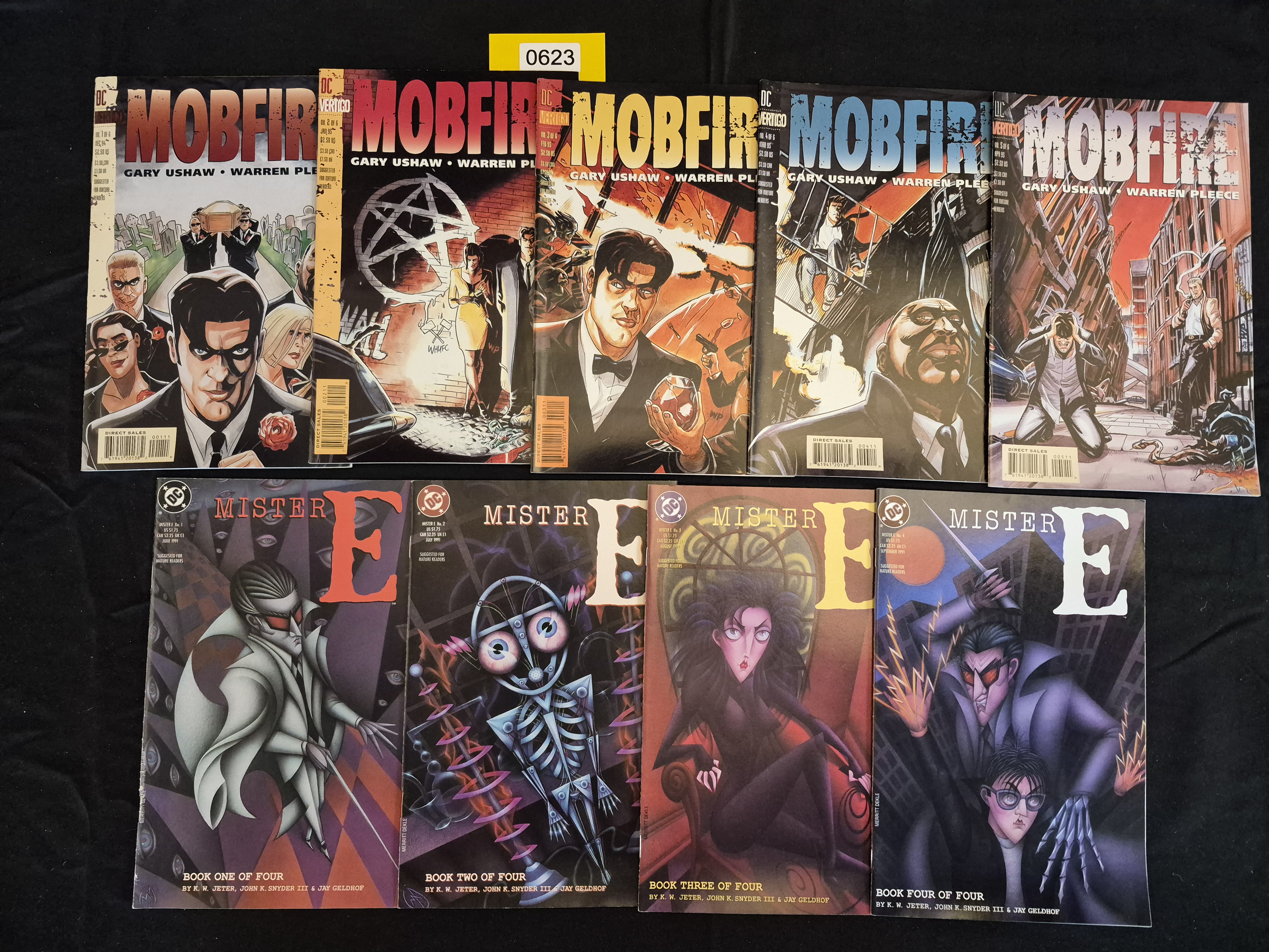 BID PER WHAT YOU SEE IN THE PHOTO, NOT THE AI GENERATED TITLES AND DESCRIPTIONS! A collection of ten (10) standard format modern comic books published by DC Comics and its Vertigo imprint, comprising two distinct complete miniseries runs from the early to mid-1990s. The lot includes the complete 6-issue miniseries Mobfire (1994-1995), published under the DC Vertigo imprint, written by Gary Ushaw and illustrated by Warren Pleece. This run includes issues numbered 1 through 6. The lot also contains the complete 4-issue miniseries Mister E (1991), published under the classic DC logo. This run includes issues titled Book One through Book Four, created by K. W. Jeter, John K. Snyder III, and Jay Geldhof. All issues feature glossy, full-color covers and display direct sales barcodes and original price markings for the US and UK markets.