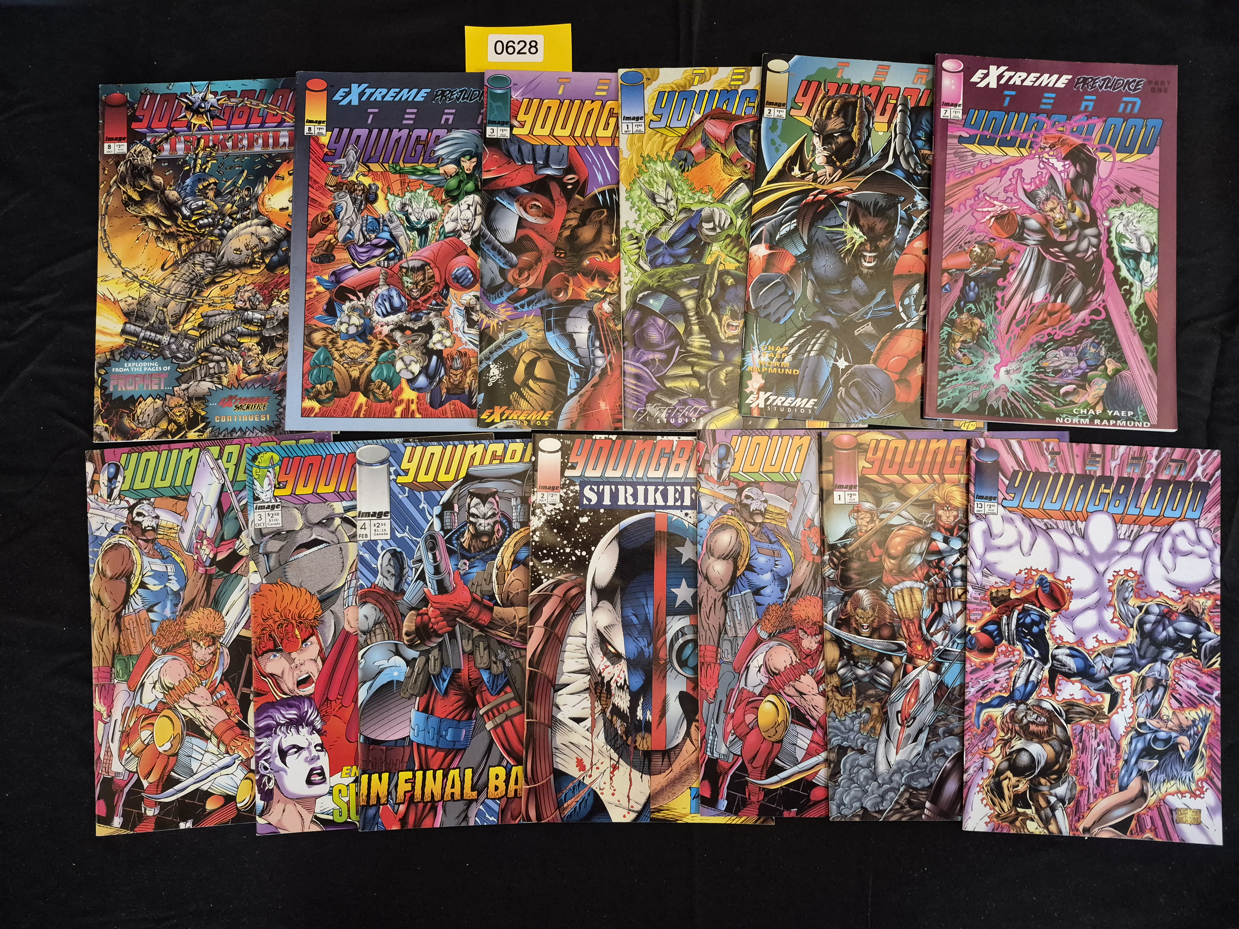 BID PER WHAT YOU SEE IN THE PHOTO, NOT THE AI GENERATED TITLES AND DESCRIPTIONS! A collection of 12 Modern Age comic books published by Image Comics, primarily featuring titles from the Youngblood and Team Youngblood series, dating from the early 1990s. The lot includes issues from various related series such as Youngblood Strikefile and crossover events like Extreme Prejudice. The comics are printed on paper with glossy color covers characteristic of the era, featuring dynamic, highly detailed illustrations typical of the Image Comics aesthetic. Visible issue numbers include #1, #2, #3, #4, #7, #8, and #13, indicating a mixed assortment of titles and issues. An inventory tag marked 0628 is adhered to the cover of one comic in the upper row.
